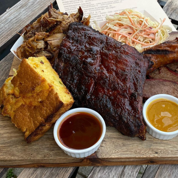 En este local moderno e informal, podrás degustar platos típicos de barbacoa, desde costillas de cerdo crujientes ahumadas y poutine de falda de ternera ahumada hasta el sándwich de pollo picante estilo Nashville y macarrones con queso a la sartén con todos los acompañamientos.