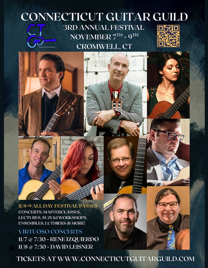 ¡Únase a nosotros para un fin de semana inolvidable celebrando el arte de la guitarra! El 3.er Festival Anual del Gremio de Guitarristas de Connecticut reúne a intérpretes, educadores y luthiers de talla mundial durante tres días de conciertos, clases magistrales, conferencias, talleres y interpretaciones en conjunto.