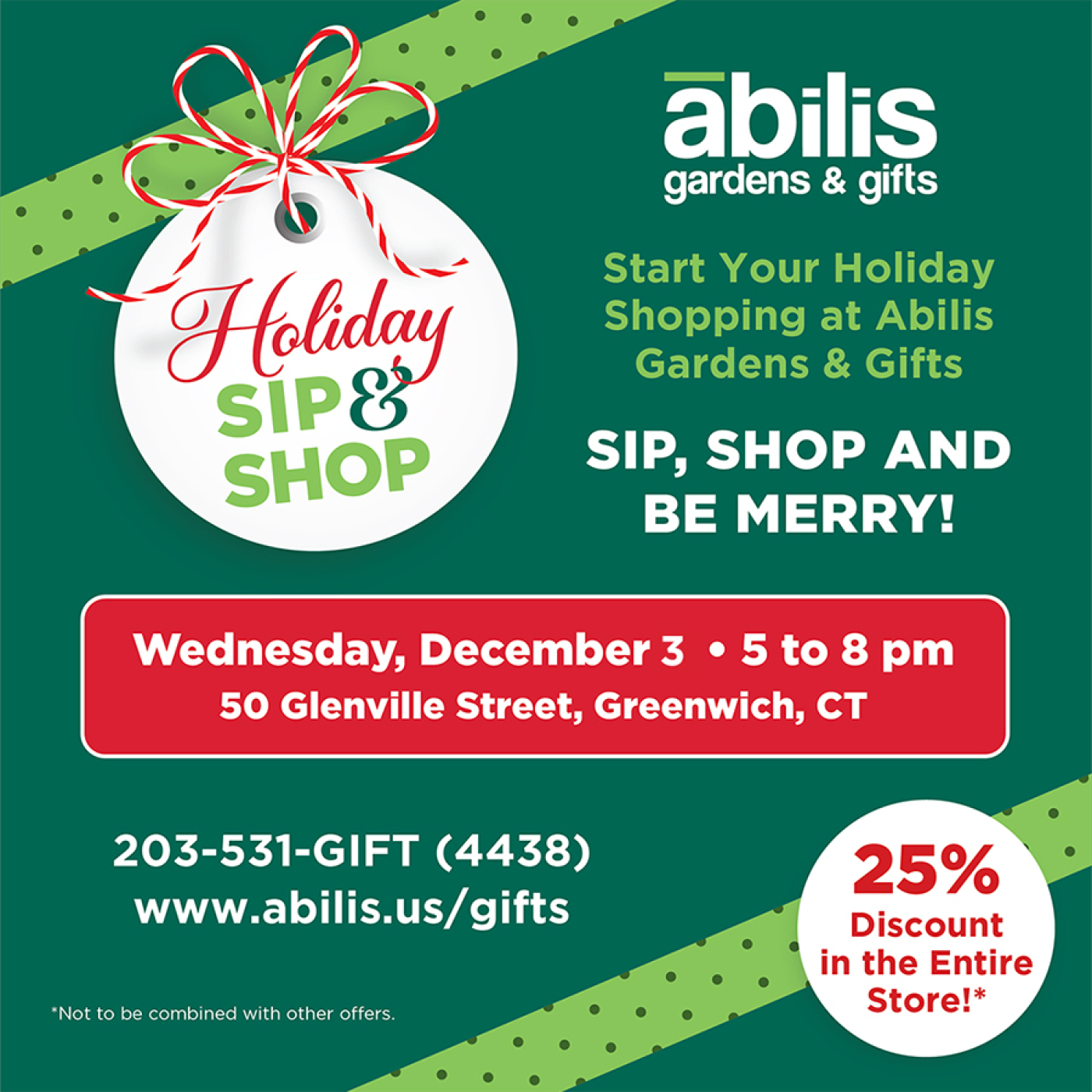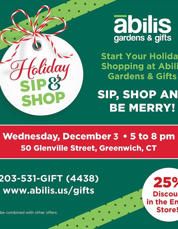 ¡Comienza tus compras navideñas en Abilis Gardens & Gifts! Disfruta, compra y diviértete en la Fiesta Navideña anual, el miércoles 3 de diciembre, de 17:00 a 20:00 h, en Abilis Gardens & Gifts, 50 Glenville Street, Greenwich, Connecticut (este año en el edificio principal de Abilis). Los asistentes disfrutarán de un 25 % de descuento en toda la tienda. También puedes encargar flores navideñas por adelantado en línea en abilis.us/gifts , llamando al 203-531-GIFT o en el evento. La Fiesta Navideña del 3 de diciembre en Abilis Gardens & Gifts es gratuita y está abierta al público.