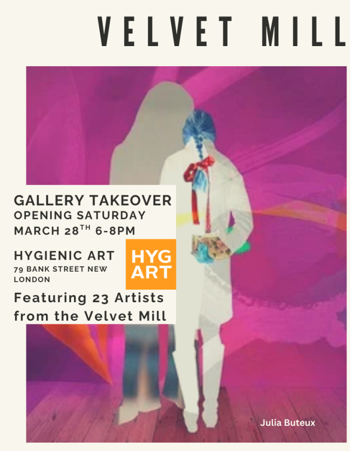 Esta primavera, la Galería de Arte Higiénico en New London da la bienvenida a una audaz toma de posesión de la galería, ya que más de 20 artistas del histórico Velvet Mill de Stonington exhiben una vibrante combinación de pintura, técnica mixta y ensamblaje en una celebración de la creatividad y la colaboración regional.