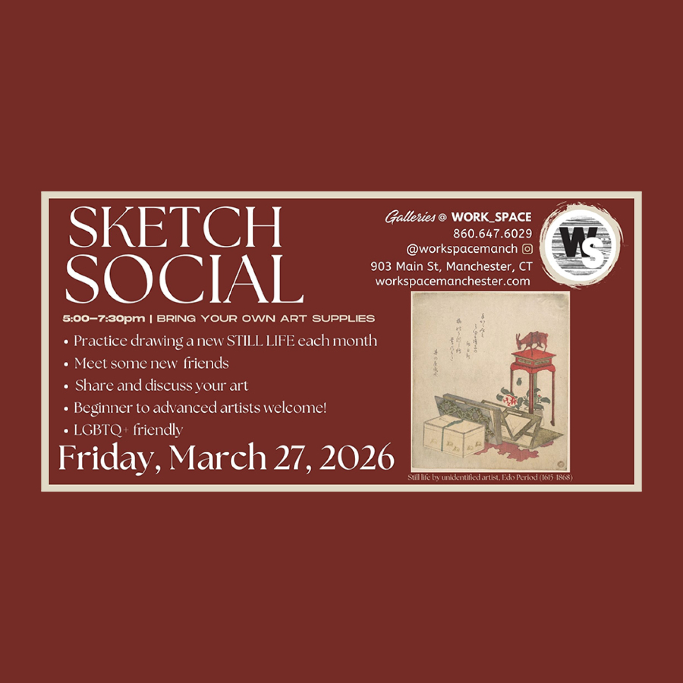 Tanto si eres un artista experimentado como si estás empezando, este evento es perfecto para quienes buscan salir del estudio y conectar con la comunidad. Practica tus habilidades de dibujo en un ambiente acogedor, conoce nuevos amigos y comparte tu arte. Cada mes crearemos un nuevo bodegón para despertar tu creatividad y conectar con tus compañeros. Coge tu cuaderno de dibujo y únete a Sketch Social, una noche de arte y conexión organizada por WORK_SPACE. ¡Nos vemos allí!