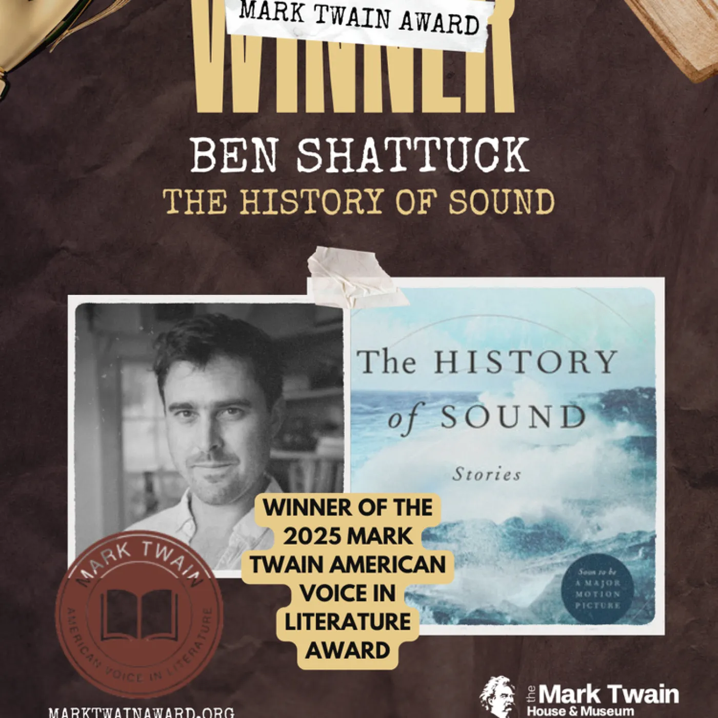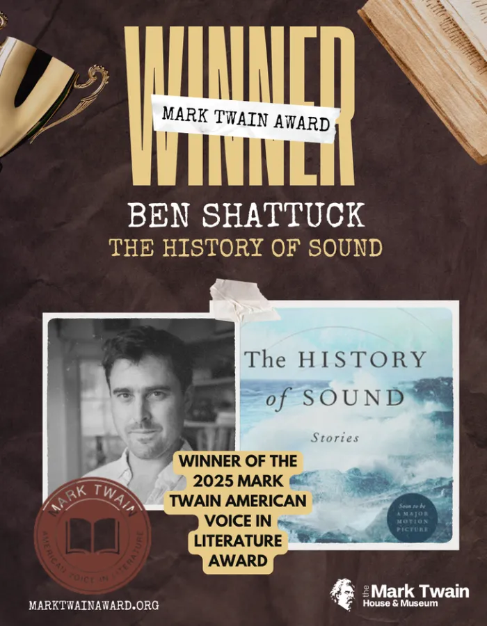 Acompáñenos el viernes 7 de noviembre a nuestra celebración para reconocer al ganador de 2025, La Historia del Sonido, de Ben Shattuck. El premio será entregado por el benefactor del premio, autor de éxitos de ventas y fideicomisario de la Casa y Museo Mark Twain, David Baldacci, con fragmentos del libro ganador leídos por el autor Ben Shattuck.