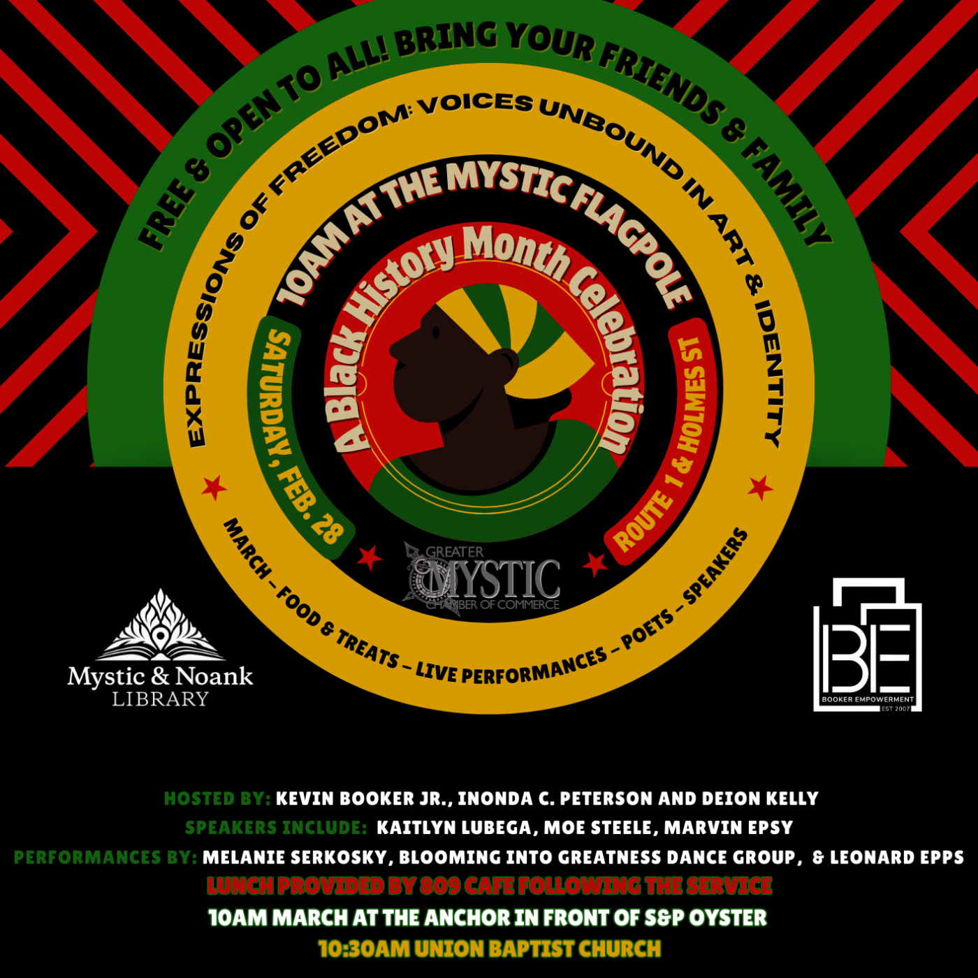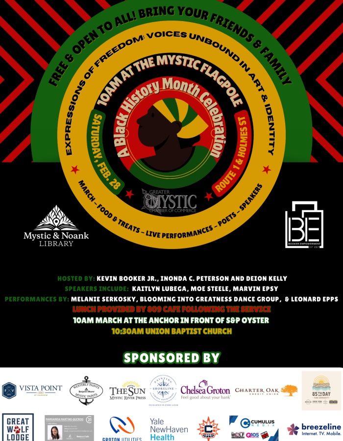 La Cámara de Comercio de Greater Mystic, en asociación con la Biblioteca Mystic & Noank, Kevin Booker Jr. e Inonda C. Peterson, presenta con orgullo el Quinto Programa Anual de Celebración del Mes de la Historia Negra, que se llevará a cabo el 28 de febrero de 2026.