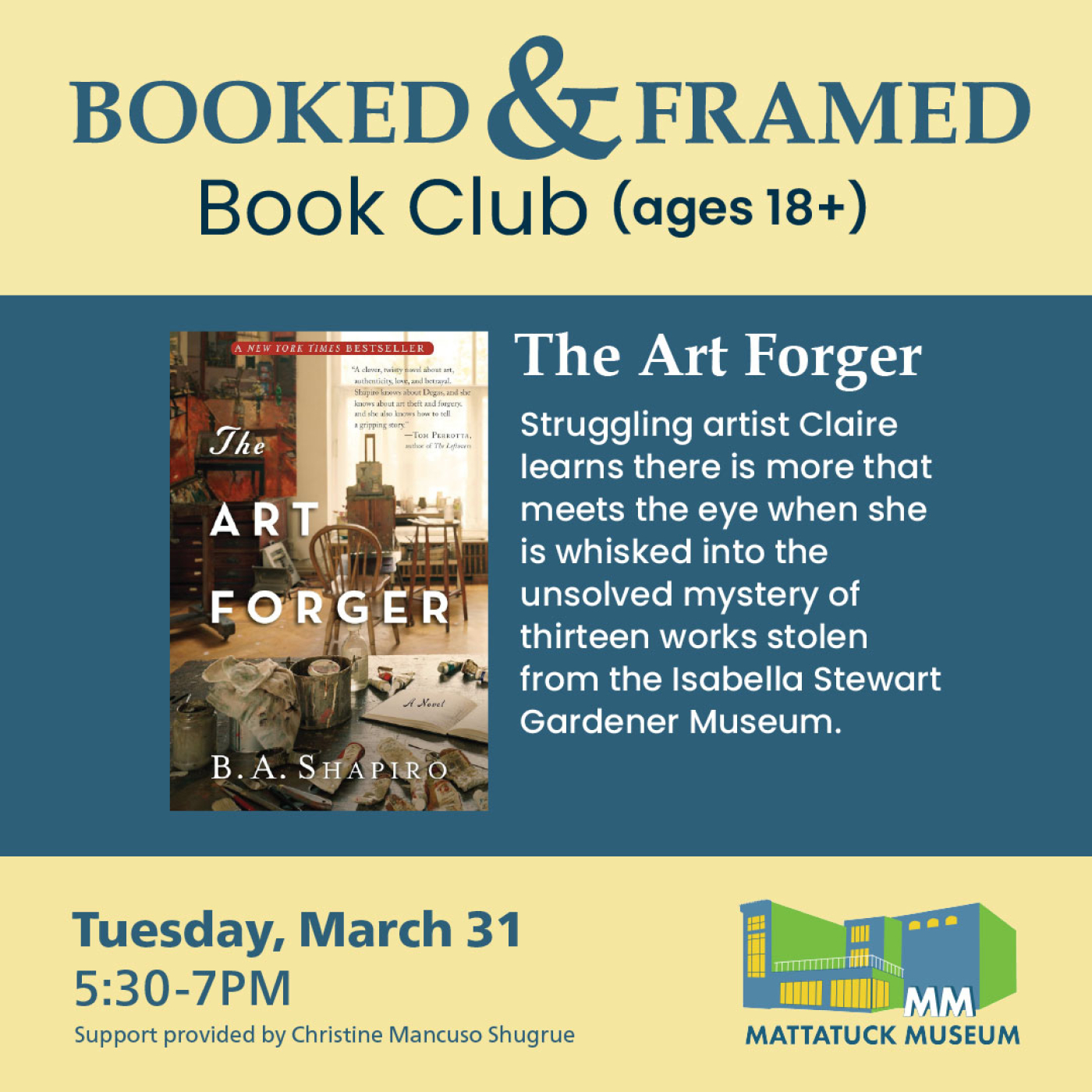 Corre el año 1990 y trece obras de arte fueron robadas del Museo Isabella Stewart Gardner de Boston. El crimen sigue sin resolverse, pero la artista Claire, que lucha por sobrevivir, está a punto de descubrir que el robo esconde algo más de lo que parece al aceptar falsificar una de las obras robadas. Pronto se encuentra en un laberinto de preguntas y secretos que esperan ser desvelados. ¿Logrará encontrar la verdad tras las piezas robadas o lo arriesgará todo en el proceso? Acompáñenos este mes a leer "El falsificador de arte" de BA Shapiro.