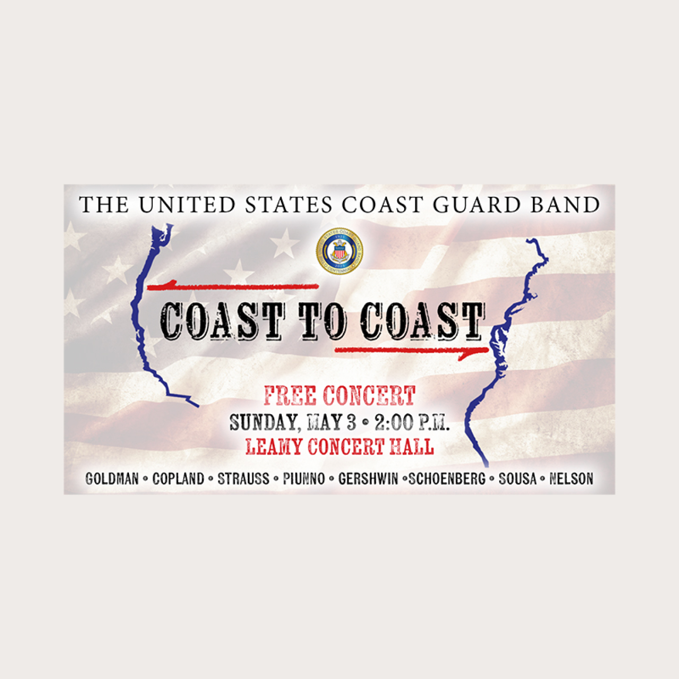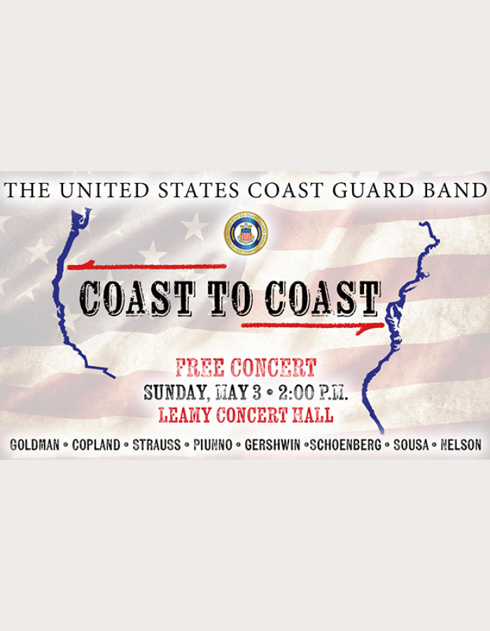 El domingo 3 de mayo a las 14:00 horas en el Leamy Hall de la Academia de la Guardia Costera de EE. UU., la banda de la Guardia Costera regresa con un magnífico programa GRATUITO dirigido por el suboficial mayor Jeffrey Spenner.