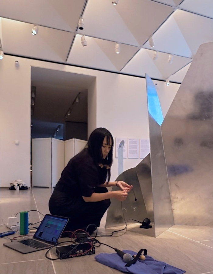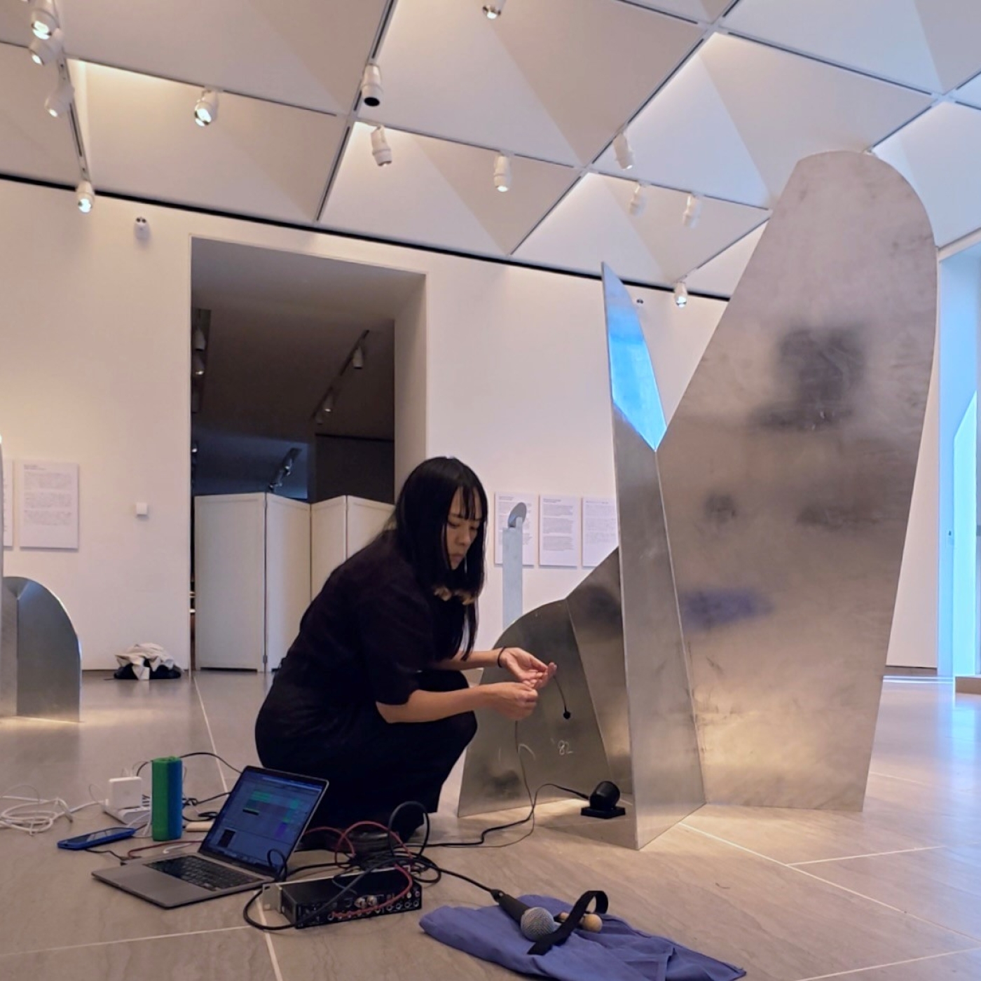 El sonido se introduce en el interior de la escultura sin contacto físico, donde se refleja y resuena, formando un circuito de retroalimentación sin contacto. Estas reflexiones se capturan y se moldean en una pista base que sirve de base para la improvisación en vivo. Más que un sistema controlado, la obra explora la retroalimentación como resonancia: un intercambio poético y autónomo entre la escultura, el espacio y el sonido.