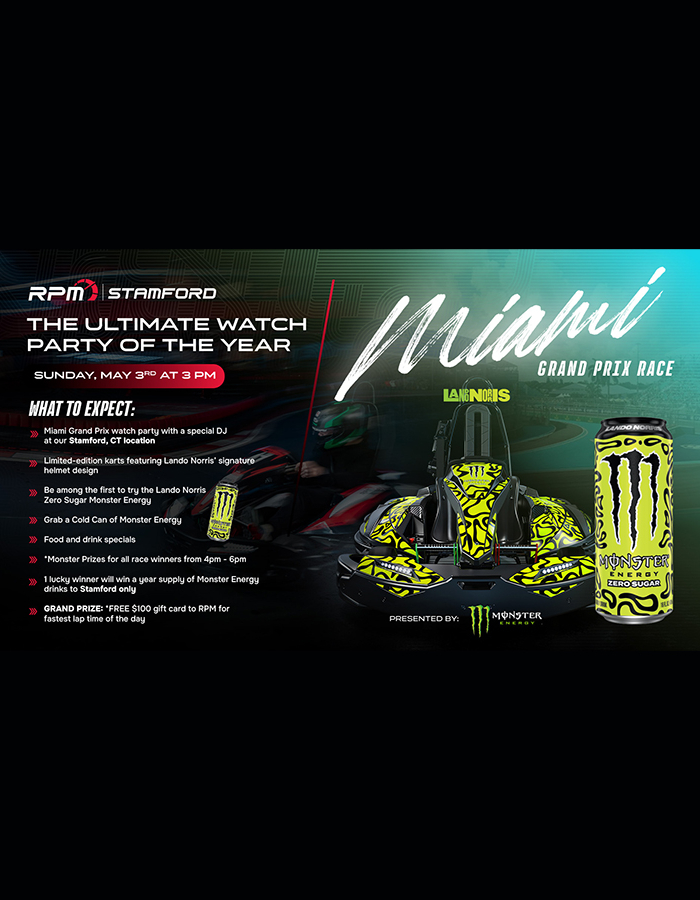 Fiesta para ver el Gran Premio de Miami en RPM Raceway Stamford con DJ en vivo y Monster Energy.
