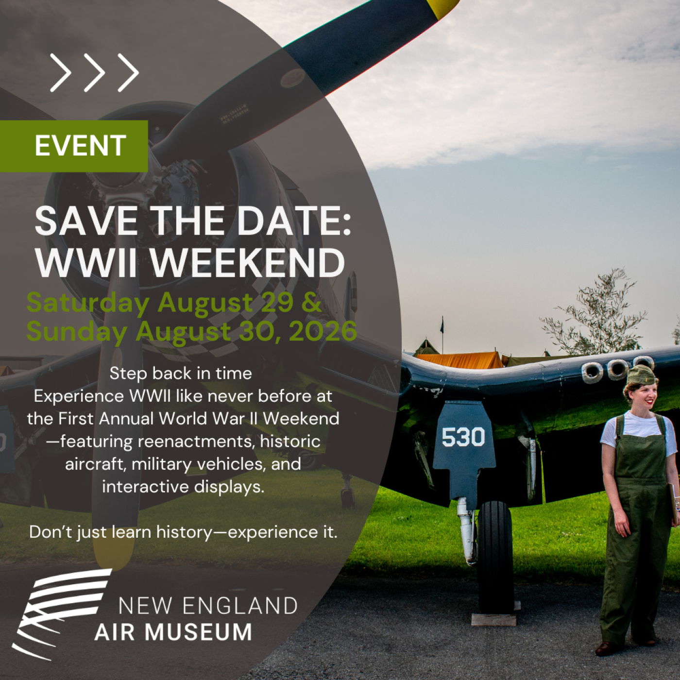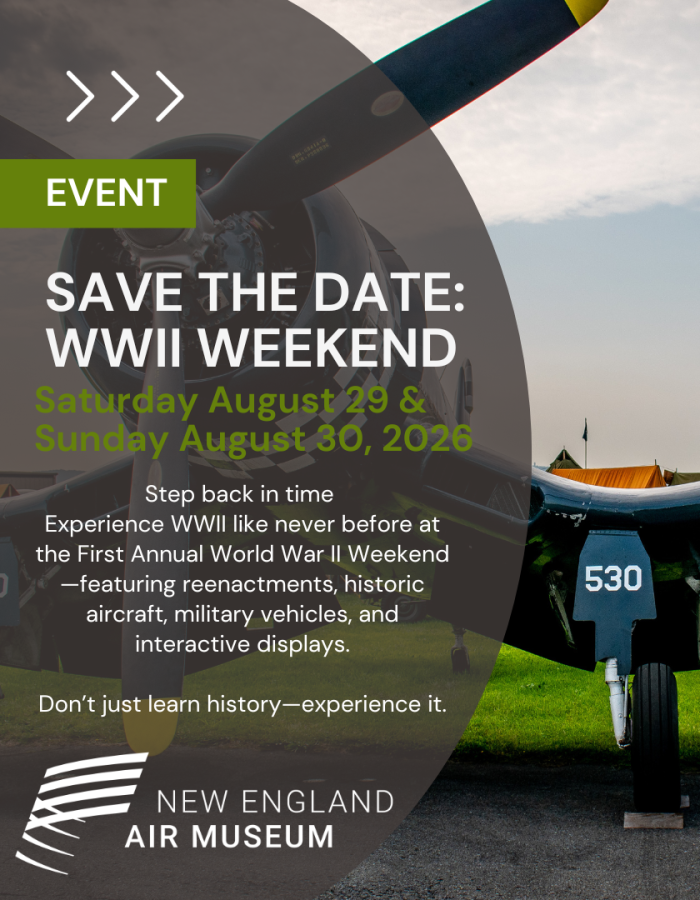 Retrocede a la década de 1940 en el Fin de Semana de la Segunda Guerra Mundial en el Museo del Aire de Nueva Inglaterra, del 29 al 30 de agosto de 2026. Disfruta de campamentos de recreación histórica, exhibiciones y demostraciones, aviones y vehículos de la Segunda Guerra Mundial, y un baile en el hangar el sábado por la noche con música de big band en vivo (entrada de septiembre). Un evento para toda la familia que da vida a la historia: no te pierdas la oportunidad de honrar y aprender sobre los hombres y mujeres de la Segunda Guerra Mundial.