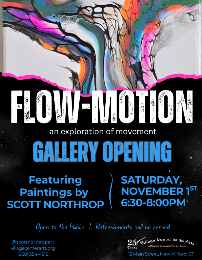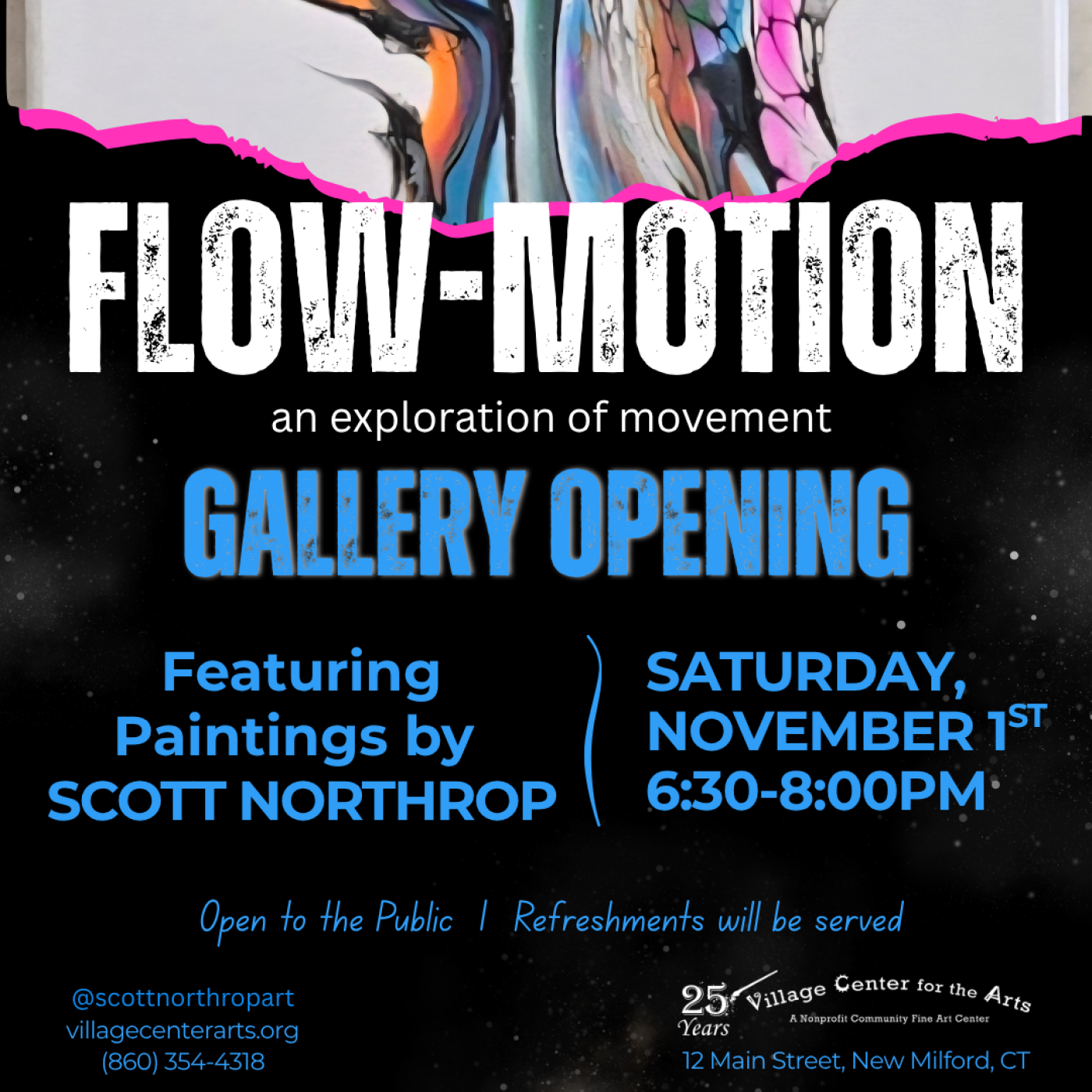 El Village Center for the Arts se enorgullece de presentar Flow-Motion, una exposición individual del artista abstracto emergente Scott Northrop, que se podrá visitar el sábado 1 de noviembre, de 18:30 a 20:00 h, en nuestra Galería Principal. Esta cautivadora muestra invita al espectador a un mundo donde la pintura, el movimiento y la emoción se fusionan, revelando el delicado equilibrio entre el control y el caos.