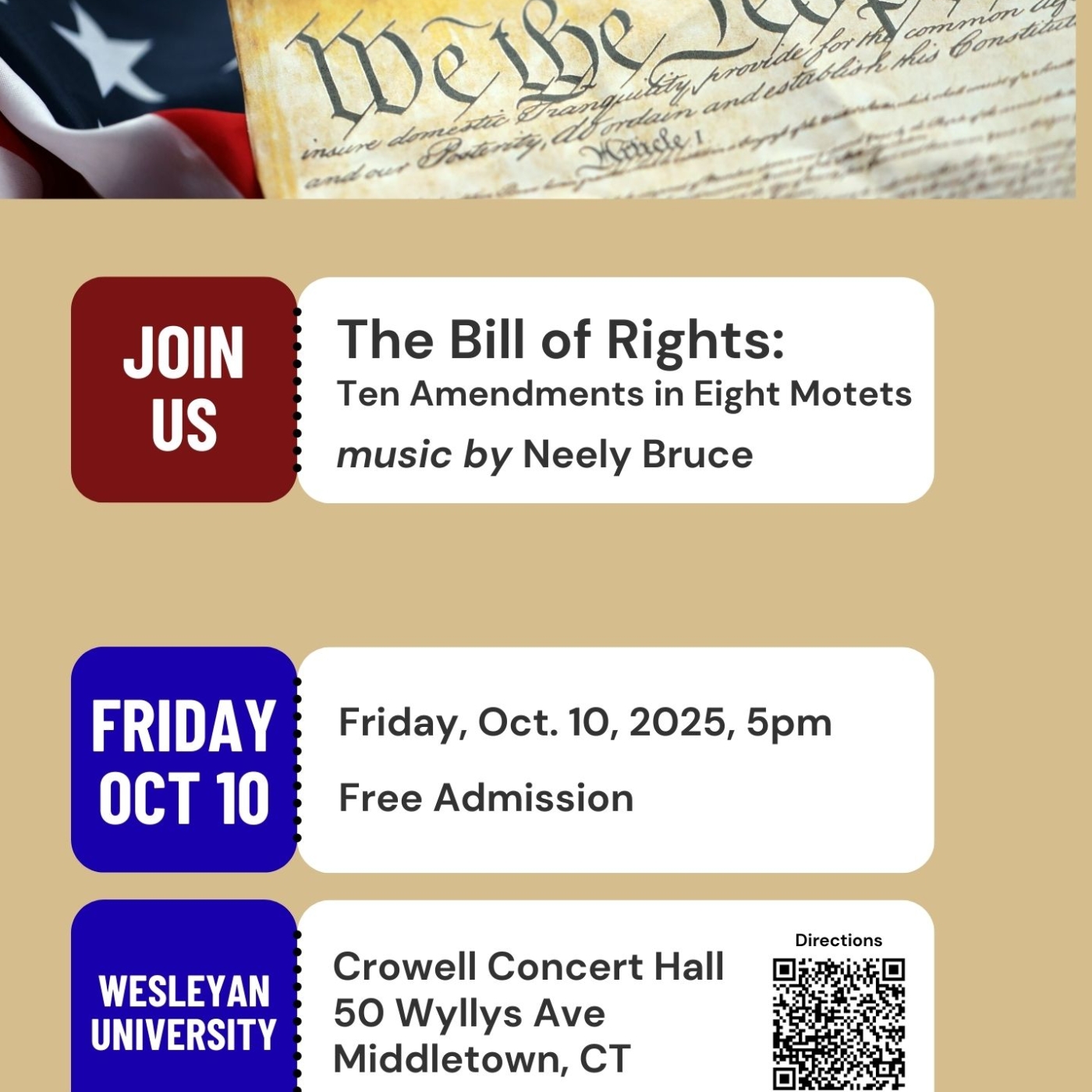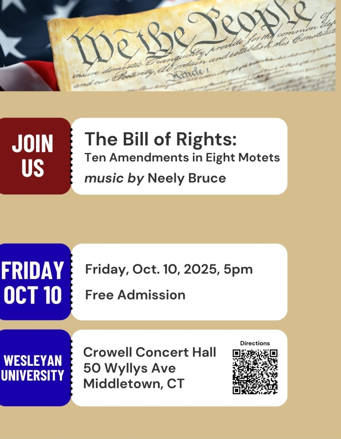 “La Carta de Derechos: Diez Enmiendas en Ocho Motetes”, con música de Neely Bruce, profesor de Música John Spencer Camp de la Universidad Wesleyana, se interpretará el 10 de octubre en la Sala de Conciertos Crowell de la Universidad Wesleyana en Middletown. Un conjunto de cantantes corales comunitarios, incluyendo a los del conjunto de cámara “Alchemy” de GMChorale, con sede en Middletown, estudiantes de Wesleyan y otros, se unirán en “Festival Harmony” para presentar esta obra, que estará acompañada por arpa, quinteto de cuerdas, flauta y oboe.