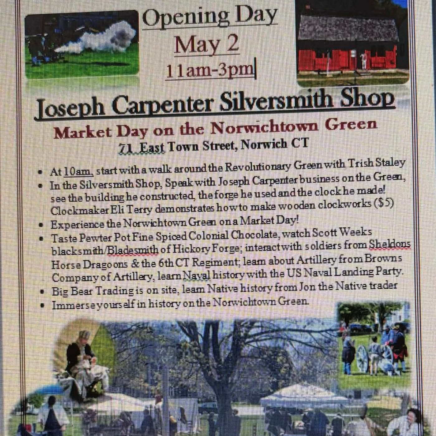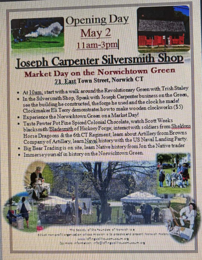 ¡Oíd, oíd! El 2 de mayo, de 11 a 15 h, abre la tienda de platería de Joseph Carpenter y se celebra el Día del Mercado en Norwichtown Green. En la tienda, converse con Joseph Carpenter, platero y relojero, sobre su trabajo y su vida en Green, y vea una demostración de relojería de madera a cargo de Eli Terry (5 $). Disfrute de un paseo por Green, donde podrá experimentar el Día del Mercado, cuando Green era el centro social y comercial de Norwich, con artesanías, ejercicios de la milicia y comerciantes ambulantes. Tome una taza de chocolate fino Pewter Pot y observe a Scott, el herrero/forjador de espadas, mostrar sus habilidades. Aprenda sobre la vida de un soldado con el 6.º Regimiento de Connecticut y los Dragones a Caballo de Sheldon, y vea la artillería de la Compañía de Artillería de Brown. Descubra la historia de los nativos americanos con Jon, el comerciante nativo. Big Bear Trading Company también estará presente. Admire una exhibición de artefactos navales con el Grupo de Desembarco Naval de los EE. UU.