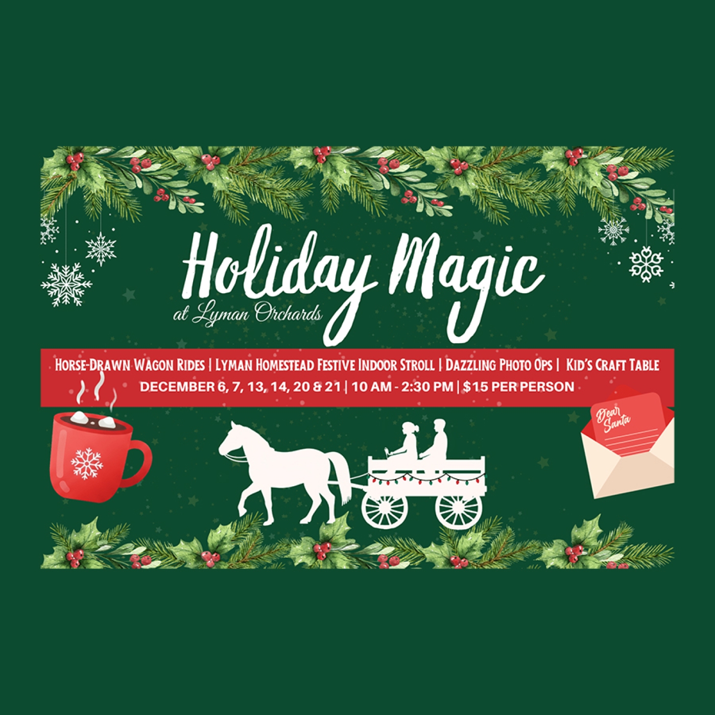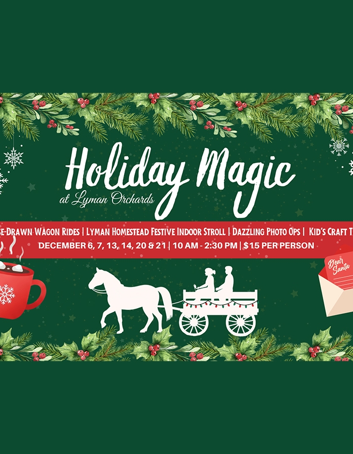 ¡Es la época más maravillosa del año y la Granja Lyman rebosa de espíritu navideño! Sumérgete en la magia de las fiestas y disfruta de un paseo festivo en carreta tirada por caballos, un sinfín de oportunidades para tomar fotos y una caminata por la Granja Lyman. ¡Disfruta de espectáculos navideños en vivo en el Apple Barrel mientras saboreas un delicioso chocolate caliente y te deleitas con nuestros famosos dulces de panadería!