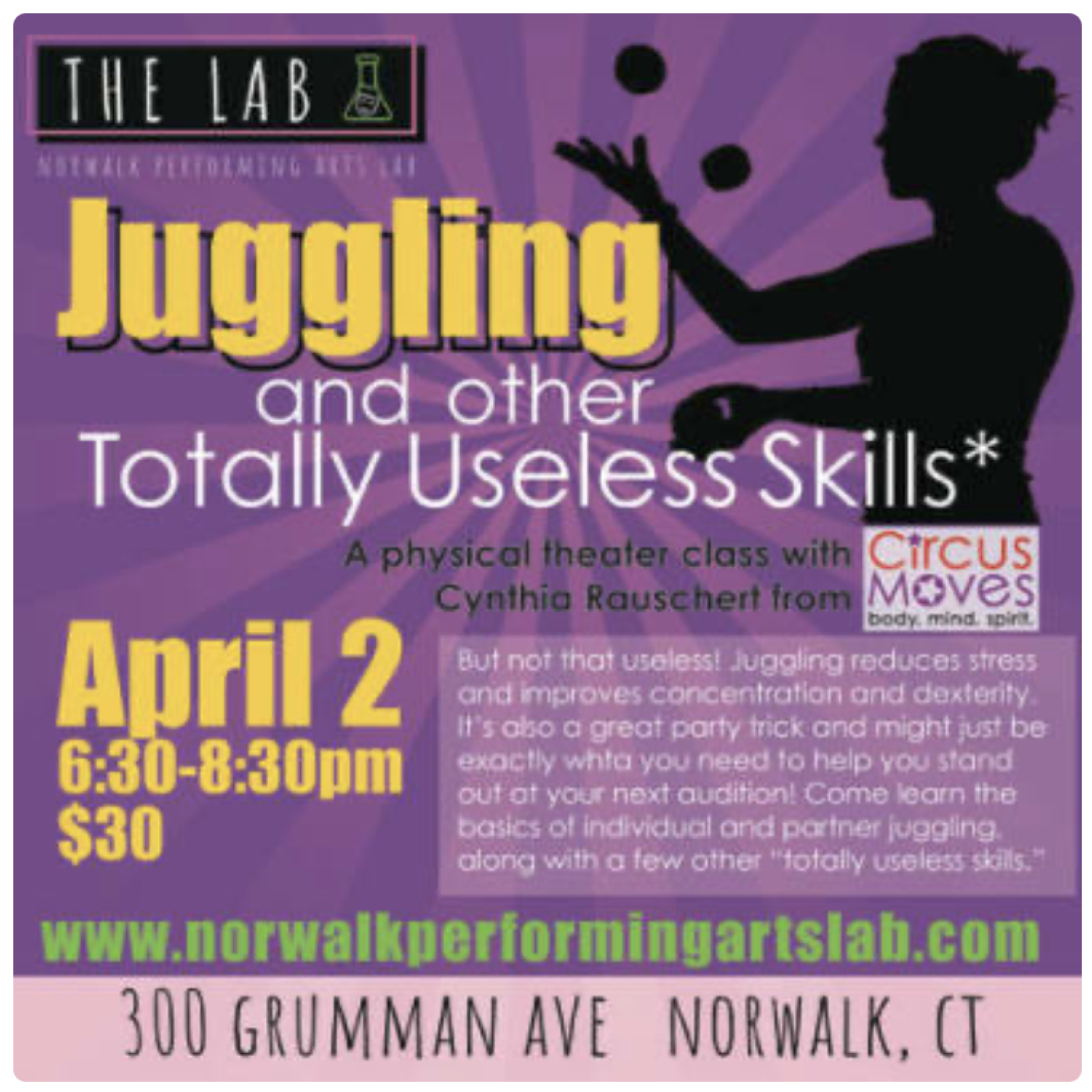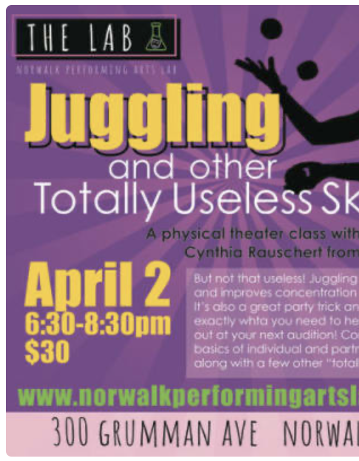¡Pero no es tan inútil! Hacer malabares reduce el estrés, mejora la concentración y la destreza. Además, es un truco genial para fiestas y podría ser justo lo que necesitas para destacar en tu próxima audición. Ven a aprender los fundamentos del malabarismo individual y en pareja, junto con otras habilidades "totalmente inútiles" :o)