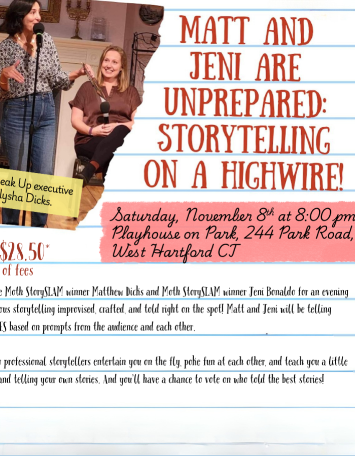 Únete a Matthew Dicks, ganador del Moth StorySLAM (61 veces), y a Jeni Bonaldo, ganadora del Moth StorySLAM, para una noche de narración sincera y divertida, improvisada, elaborada y contada al instante. Matt y Jeni contarán HISTORIAS INNOVADORAS basadas en las sugerencias del público y de cada uno.