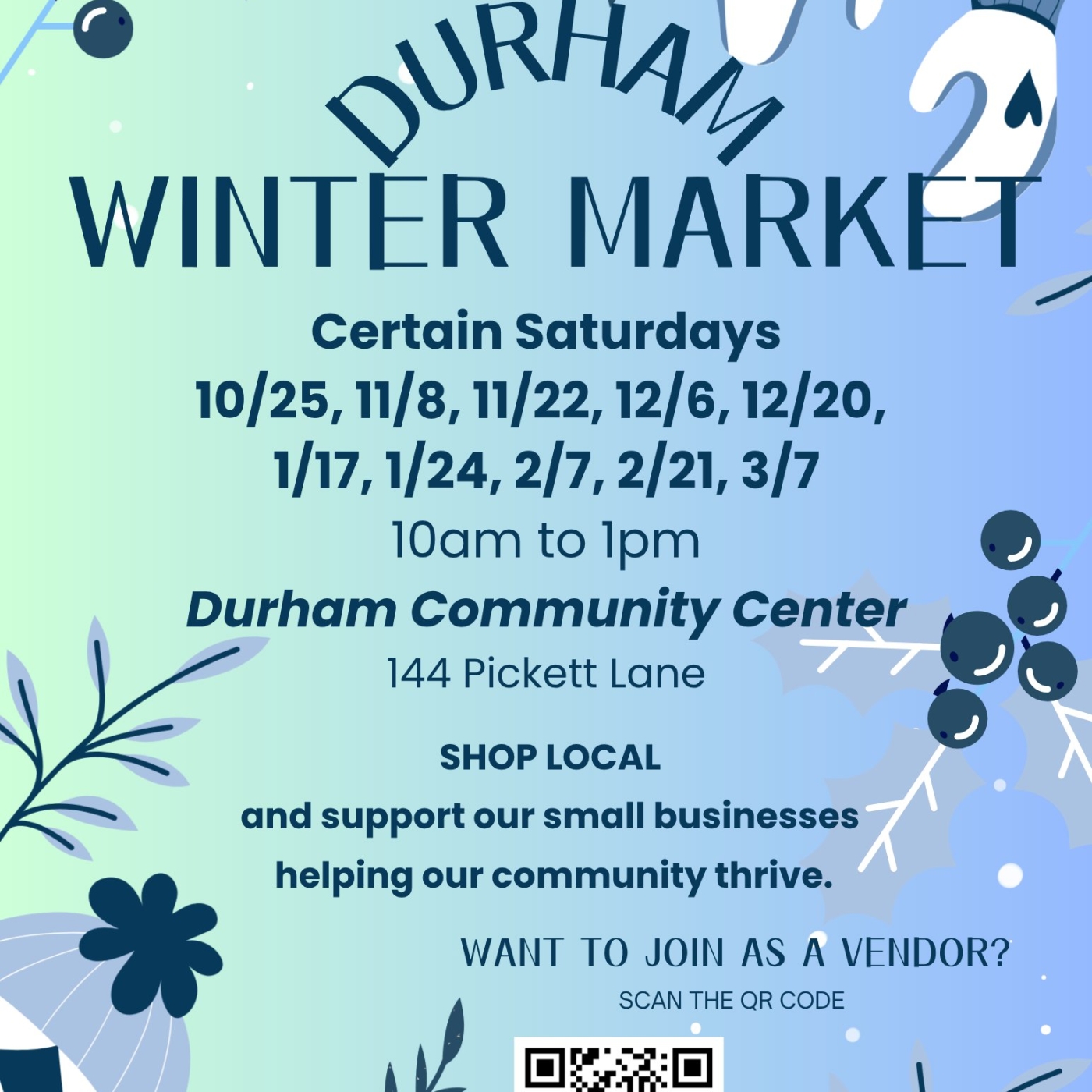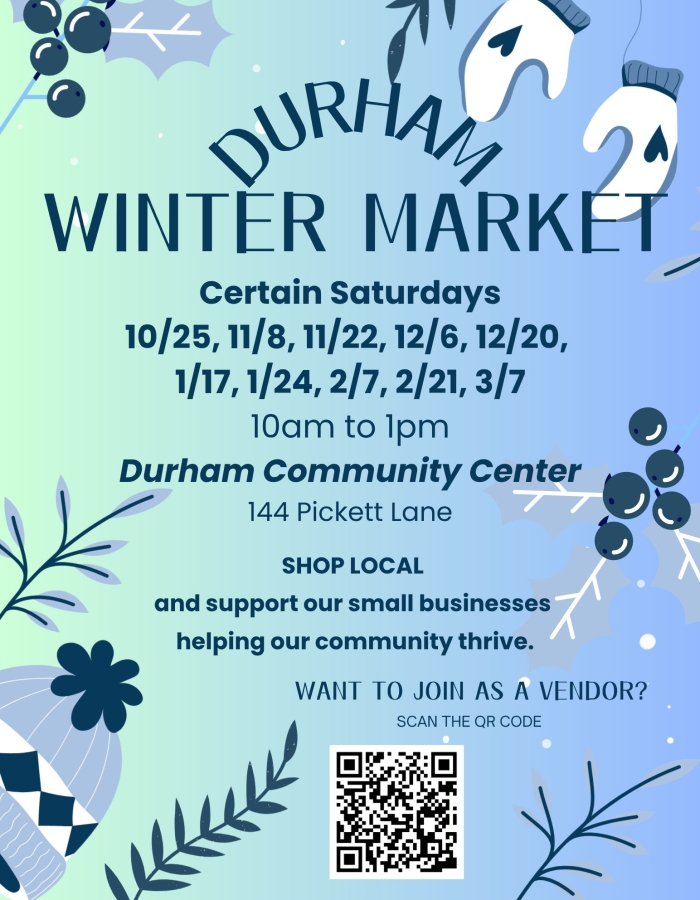 ¡Nuestro Mercado de Invierno ya está aquí! Consulta a continuación la lista de vendedores y sus productos. Recuerda que el mercado estará abierto este sábado de 10:00 a 13:00 en el Centro Comunitario de Durham, ubicado en 144 Pickett Lane, Durham. ¡Sigue las señales en Main Street! El acceso al Centro Comunitario de Durham es por Pickett Lane y Maiden Lane, saliendo de Main Street. ¡Te esperamos en el Mercado de Invierno! ¡Ven a apoyar este maravilloso evento que une a la comunidad!