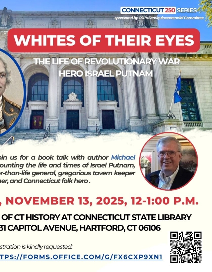 El Museo de Historia de Connecticut, ubicado en la Biblioteca Estatal de Connecticut, invita al público a la presentación del libro sobre el héroe de la Guerra de Independencia, Israel Putnam, el jueves 13 de noviembre de 2025 a las 12:00 h. El autor, Michael Shay, hablará sobre el general Putnam y sus contribuciones tanto a Connecticut como a la nación durante la Revolución Americana.