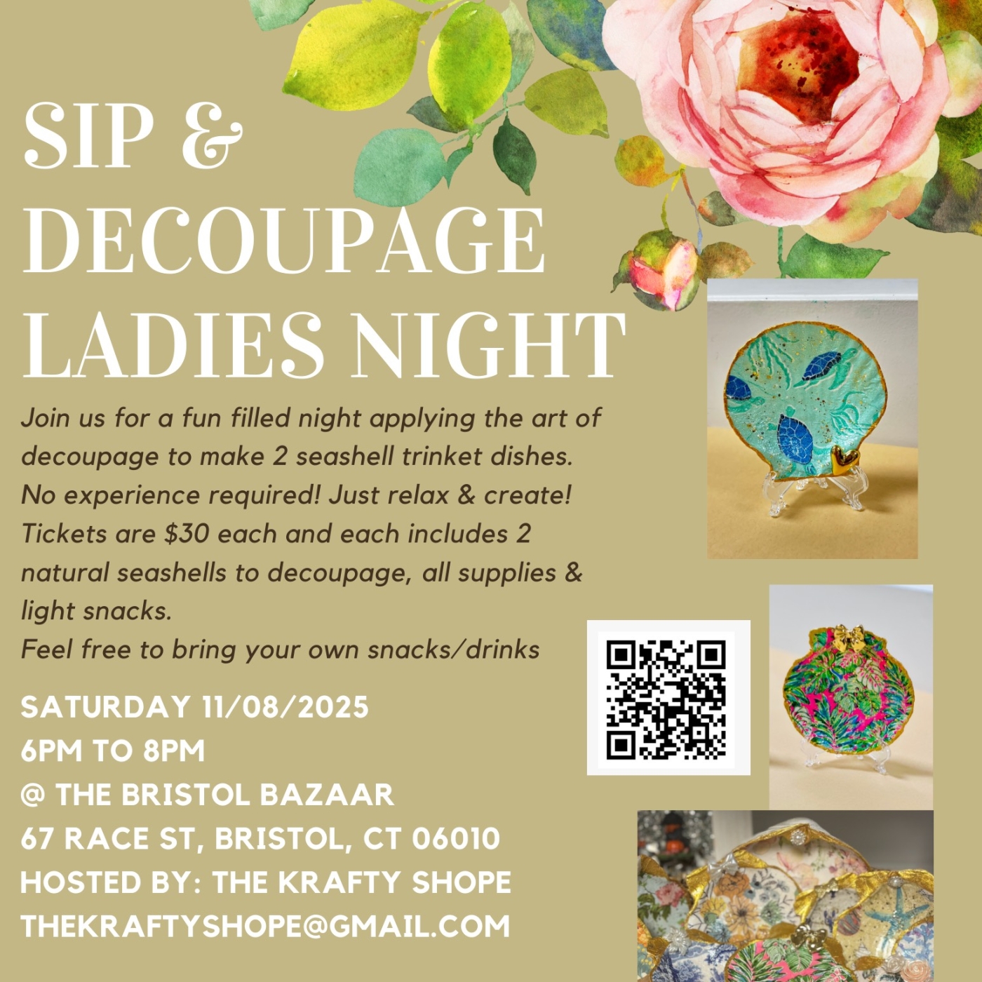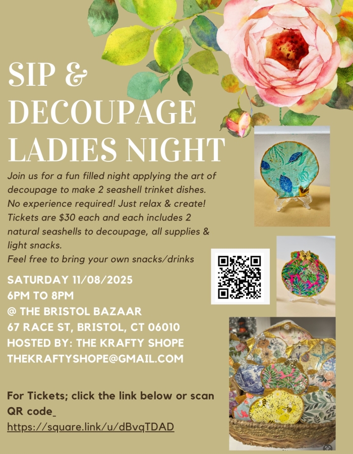 Acompáñenos al Bristol Bazaar para una noche divertida utilizando el arte del decoupage para reciclar dos conchas marinas naturales y crear hermosos porta anillos o adornos. Cada concha mide entre 10 y 12 cm y tendremos una amplia variedad de servilletas y adornos para decorar. No se necesita experiencia, solo aporta tu creatividad.
