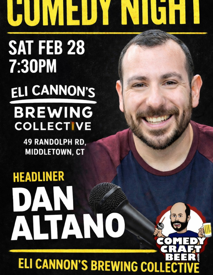 Acompáñenos a la Noche de Comedia en Eli Cannon's Brewing Collective en Middletown. Esta cervecería artesanal ofrece 7 líneas de cerveza de barril, cócteles artesanales, sidra local y vino. Hay un food truck en las instalaciones. Venga temprano para pedir bebidas, comida y disfrutar del ambiente antes del espectáculo.