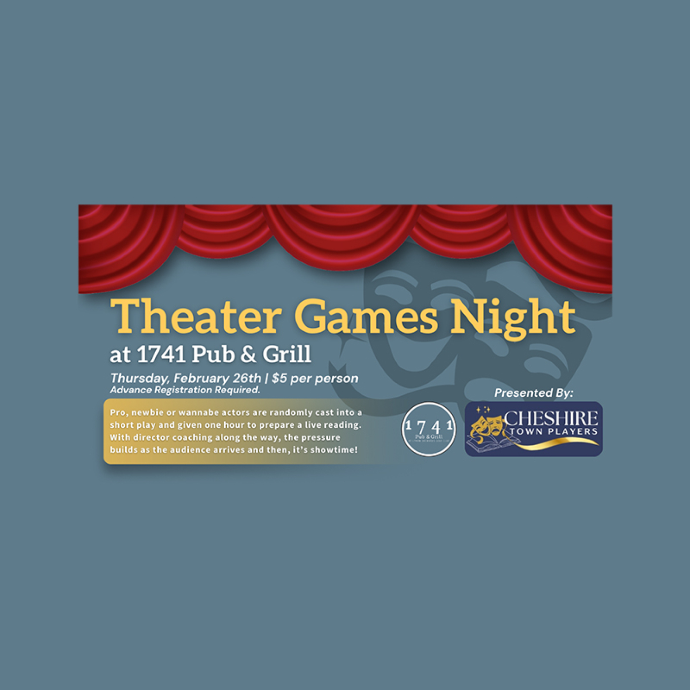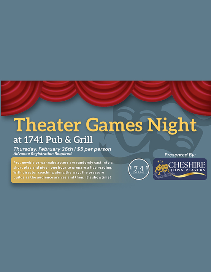 Jueves 26 de febrero en 1741 Pub & Grill. Donación de $5 por persona a Cheshire Town Players (artistas y público).