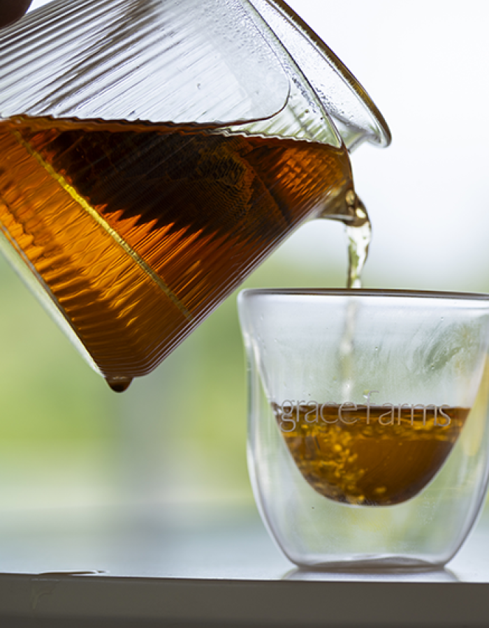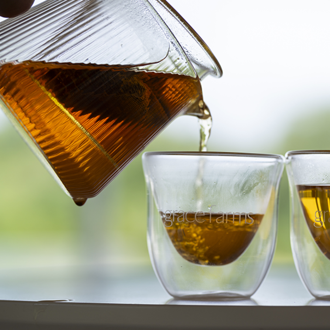 Relájese en el tranquilo Pabellón y saboree una selección de tres tés de bienestar de Grace Farms: Descanso, Respiración y Relajación. Los tés se combinan con ideas para la autorreflexión, adaptadas de la publicación "River Retreat " de Grace Farms.