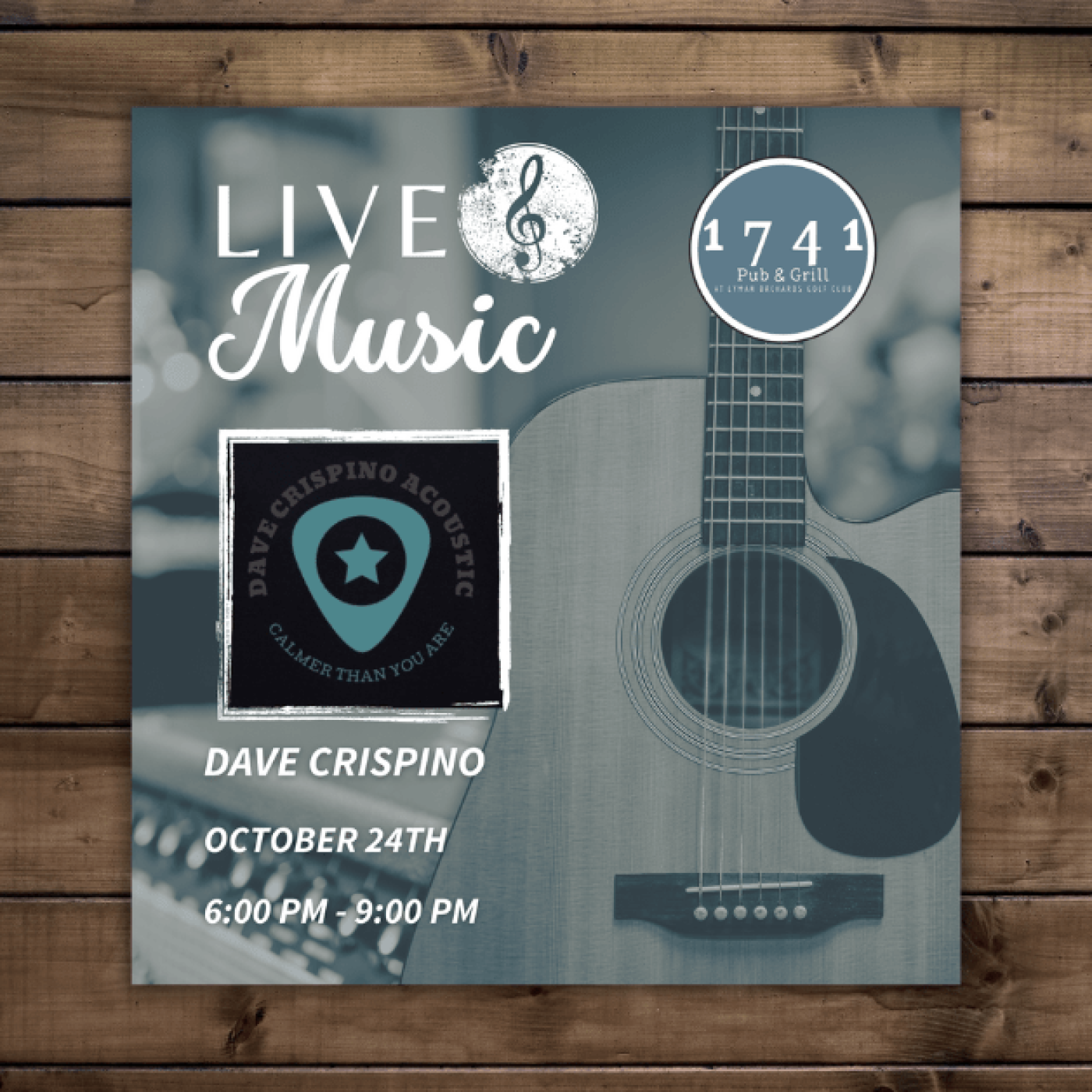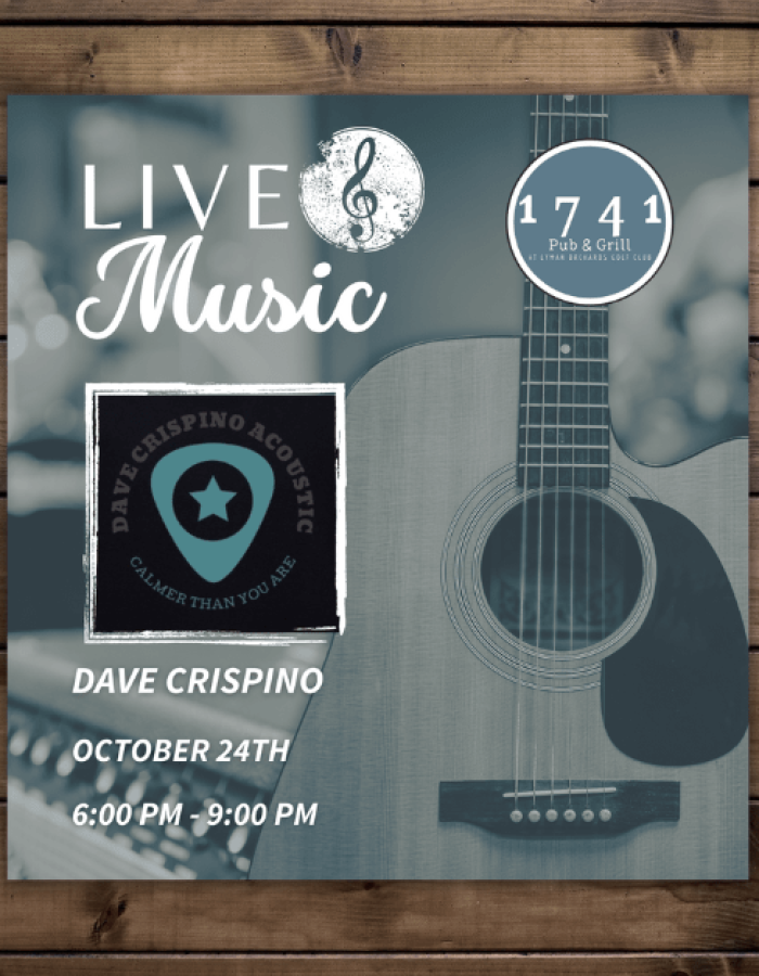 ¡Únase a nosotros para disfrutar de música en vivo, excelente comida y bebidas en 1741 Pub & Grill los viernes por la noche de octubre! El 24 de octubre, Dave Crispino tocará de 18:00 a 21:00.
