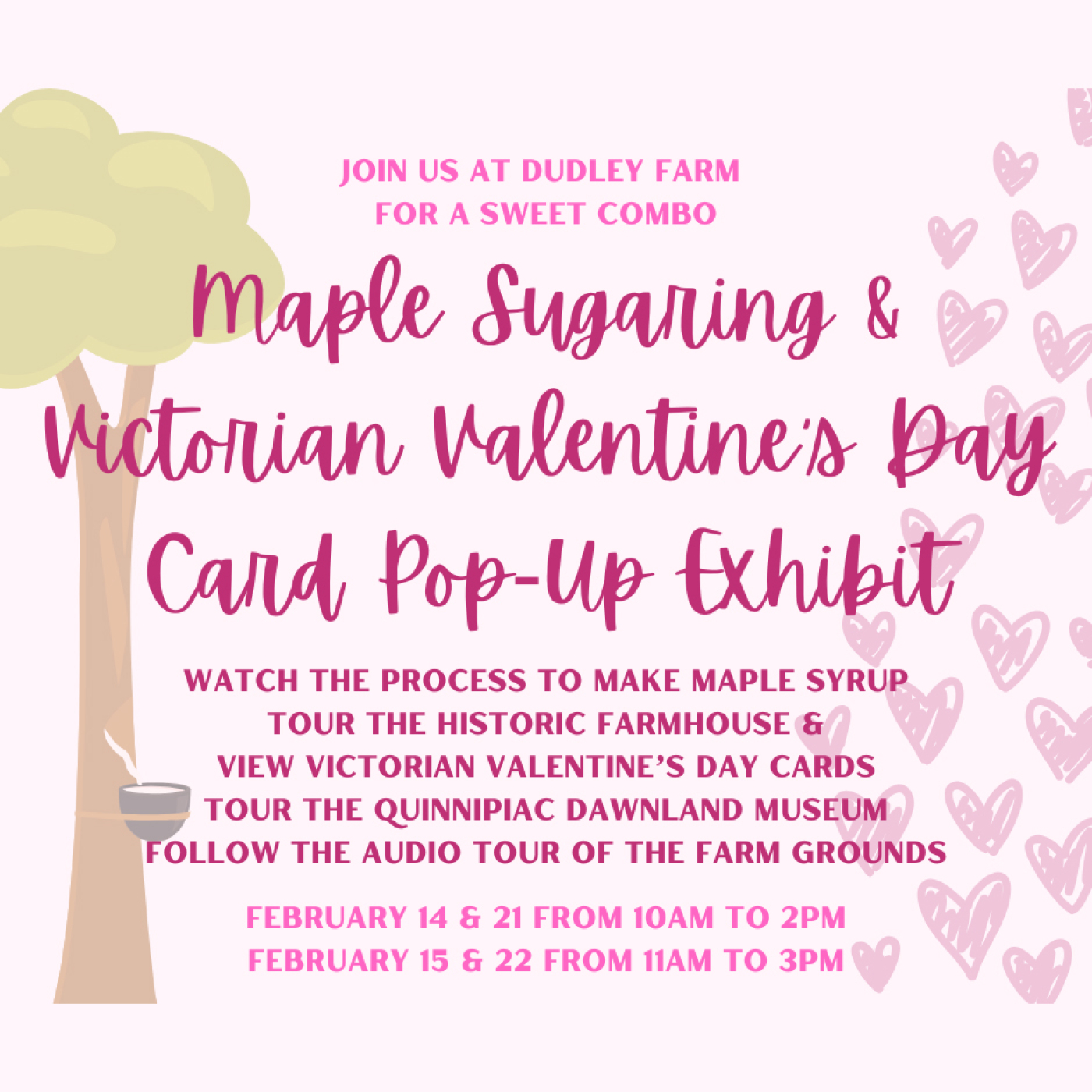 Acompáñenos el 14, 15, 21 y 22 de febrero para nuestra demostración anual de elaboración de jarabe de arce y una exposición temporal sobre tarjetas victorianas de San Valentín. Observe el proceso de elaboración del jarabe de arce, visite la histórica granja y vea tarjetas victorianas de San Valentín y vinagre, visite el Museo Quinnipiac Dawnland y disfrute de la audioguía por los terrenos de la granja.
