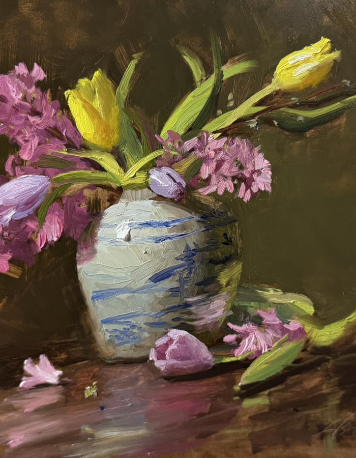- Una subasta silenciosa que incluye "Spring Forays", una vibrante naturaleza muerta de la galardonada artista de LAA, Kelli Folsom.