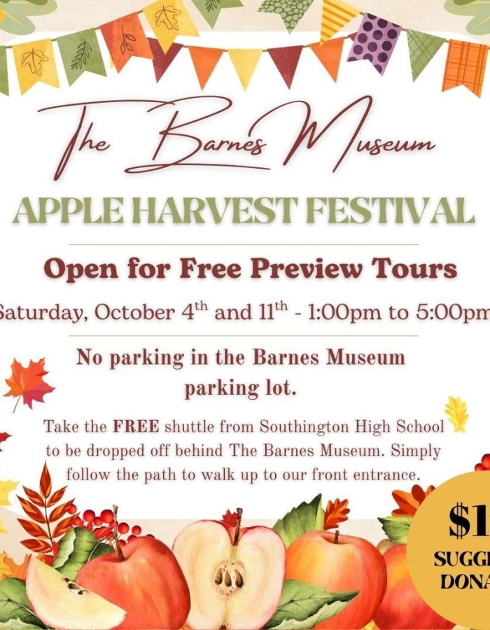 Para visitar el Museo Barnes durante el Festival de la Cosecha de Manzanas , tome el servicio de transporte que sale de la Escuela Secundaria Southington. El transporte dejará a los visitantes en el estacionamiento detrás del Museo Barnes, accesible por la Avenida Merrell. Desde allí, siga el sendero designado hasta la entrada principal del museo para acceder a la primera planta.