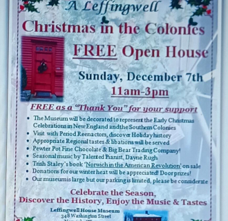 El Museo Casa Leffingwell es propiedad de la Sociedad de los Fundadores de Norwich, Connecticut, y está gestionado por ella. El Museo Casa Leffingwell (circa 1675) es uno de los mejores ejemplos restaurados de la arquitectura colonial de Nueva Inglaterra.