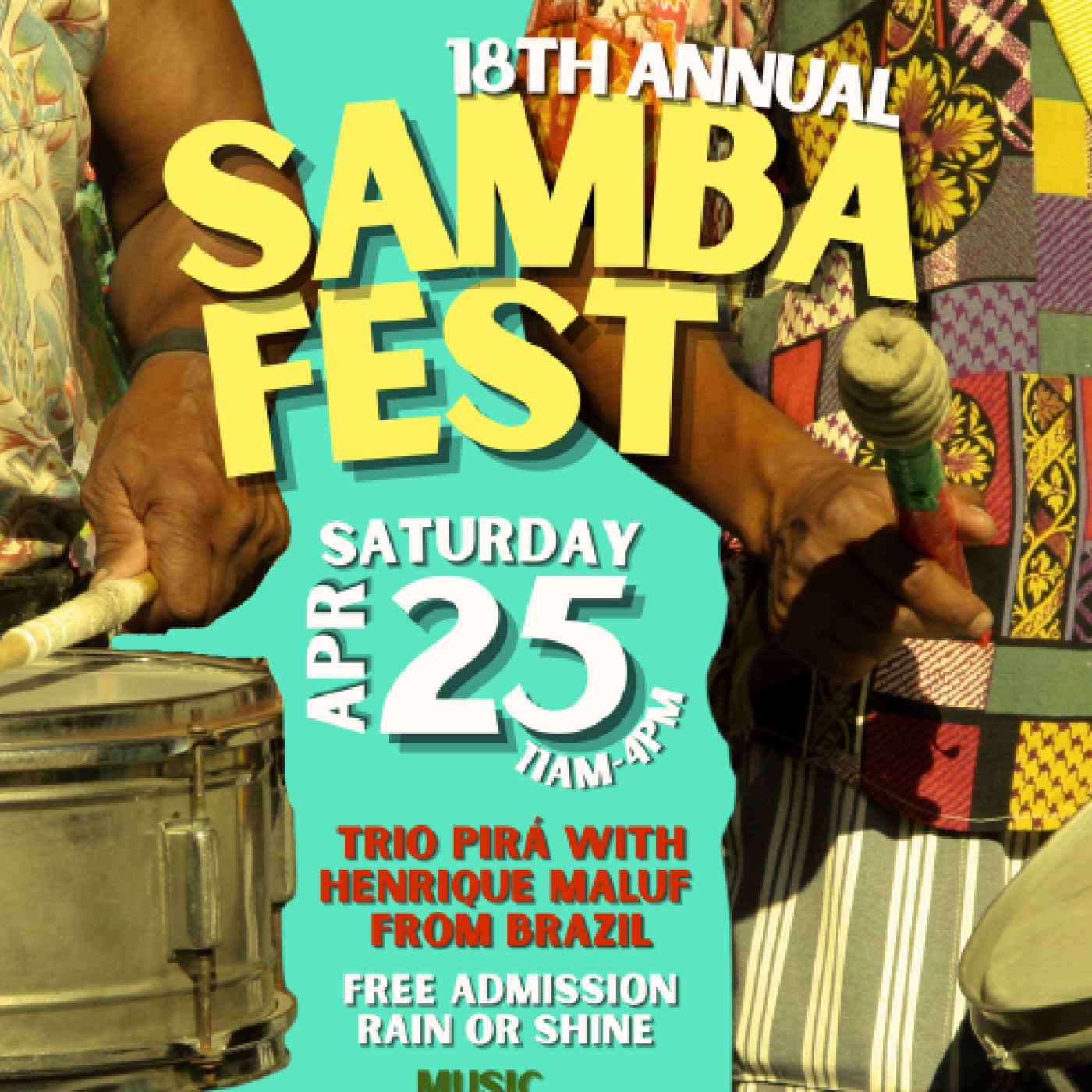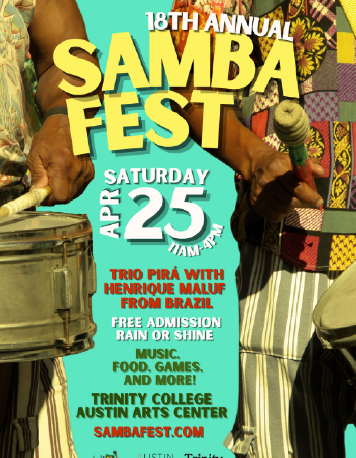 Samba Fest is thrilled to return for its 18th year as a beloved celebration of music, dance, and community, on Saturday, April 25th, 11 a.m.- 4:00 p.m. in front of the Austin Arts Center at Trinity College (300 Summit St., Hartford, CT, 06106). Featured performers include Henrique Maluf and Trio Pirá from Brazil, Trinity Steel, Waterbury’s Wilby High School, West Hartford’s Sedgwick Middle School, West Hartford Public Schools “Voices of Belonging” Middle School Program, Hartford Hot Several, Hartford’s Proud Drum and Drill Dance Corp, and Brazilian dance workshops with Efraim Silva and Thelma Ladeira. At noon, all are invited to join in participatory drumming at the community “Big Bang," and enjoy live music, food trucks, games, crafts, and share in the spirit of Brazilian Celebration.