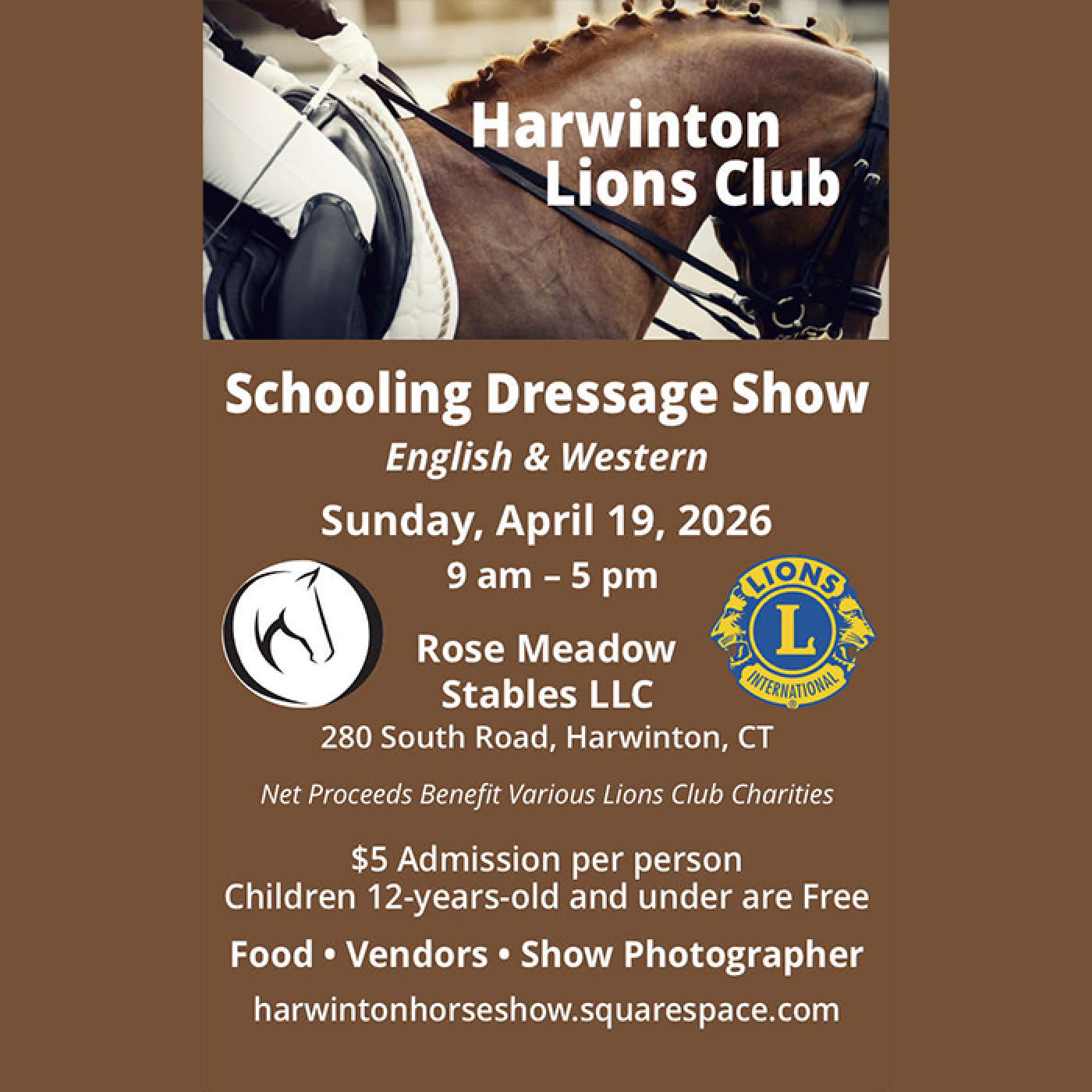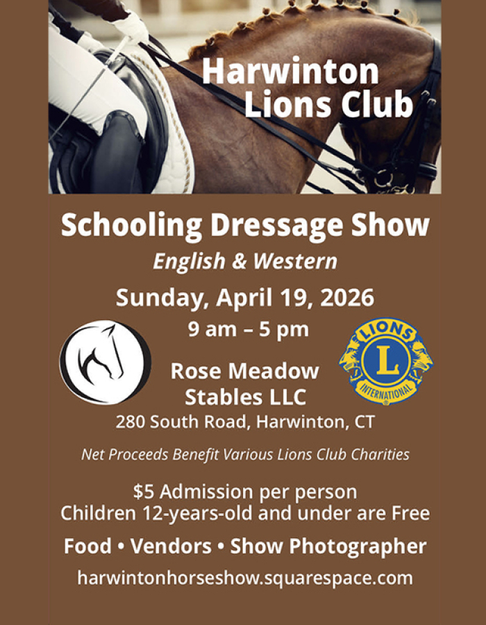 Mark your calendars for the 4th annual Harwinton Lions Club Horse Show! On Sunday, April 19, 2026, the show will feature both English and Western Dressage at the Rose Meadow Stables, LLC, 280 South Road, Harwinton, CT. Proceeds from the show will benefit various Harwinton Lions Club charities. The event will be held beginning at 9 am.