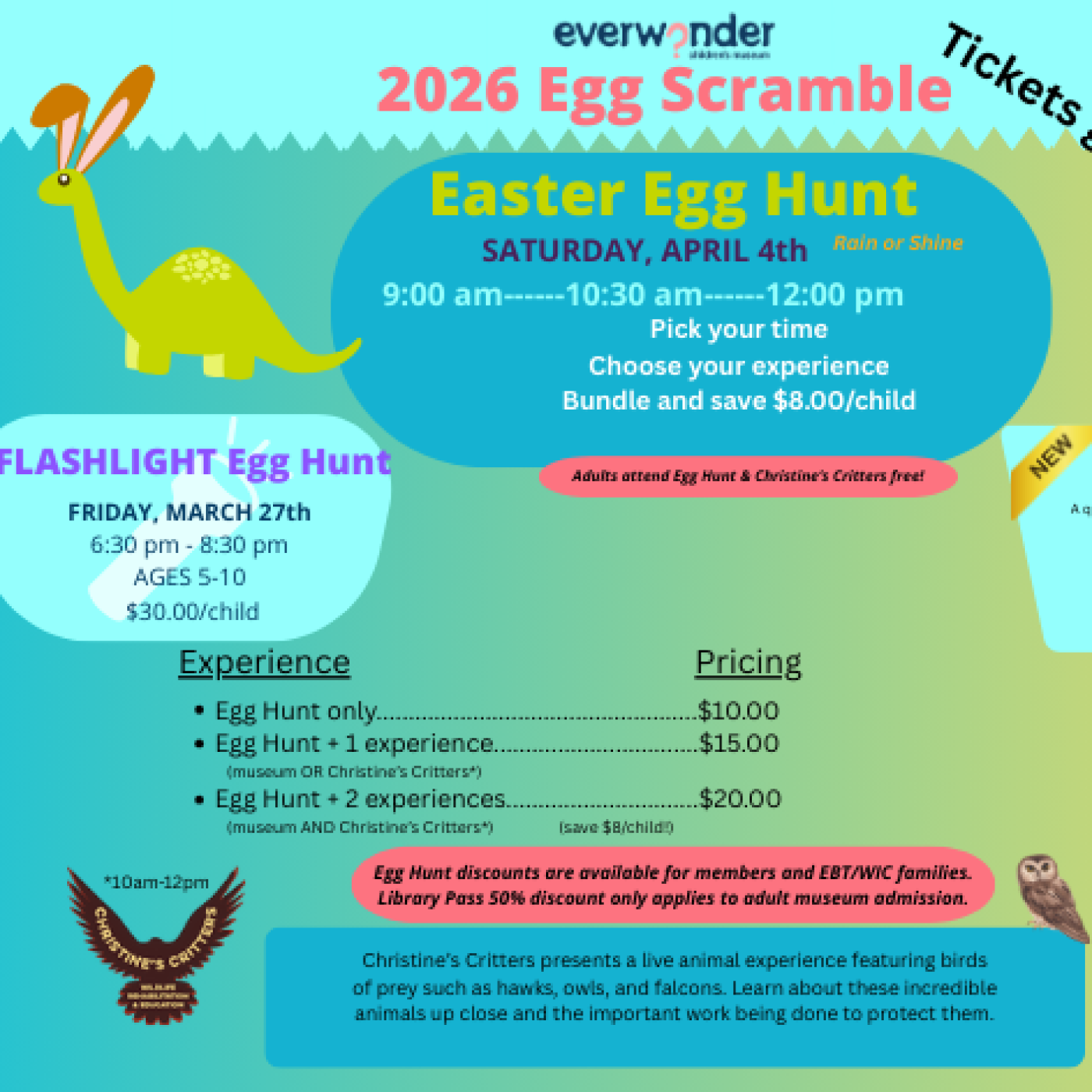 - Families with a 9:00 am egg hunt who add Christine’s Critters may need to wait until 10:00 am to attend if museum admission was not purchased.