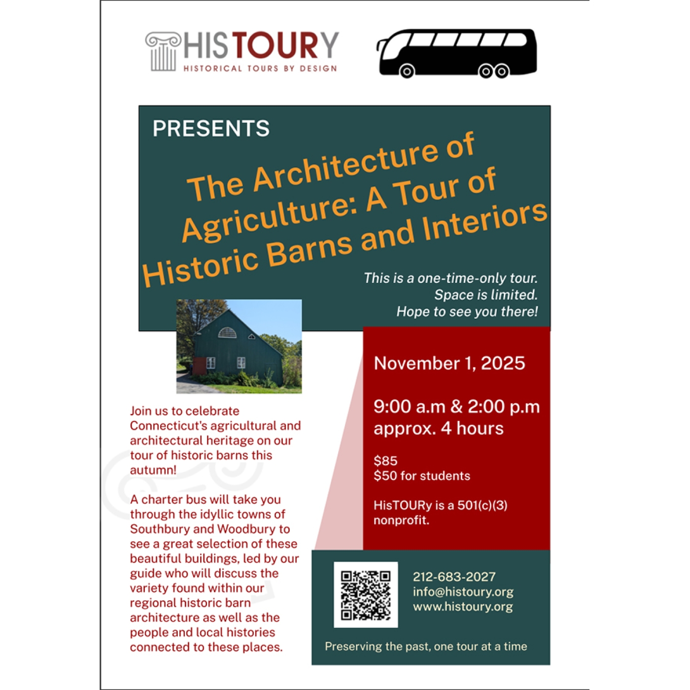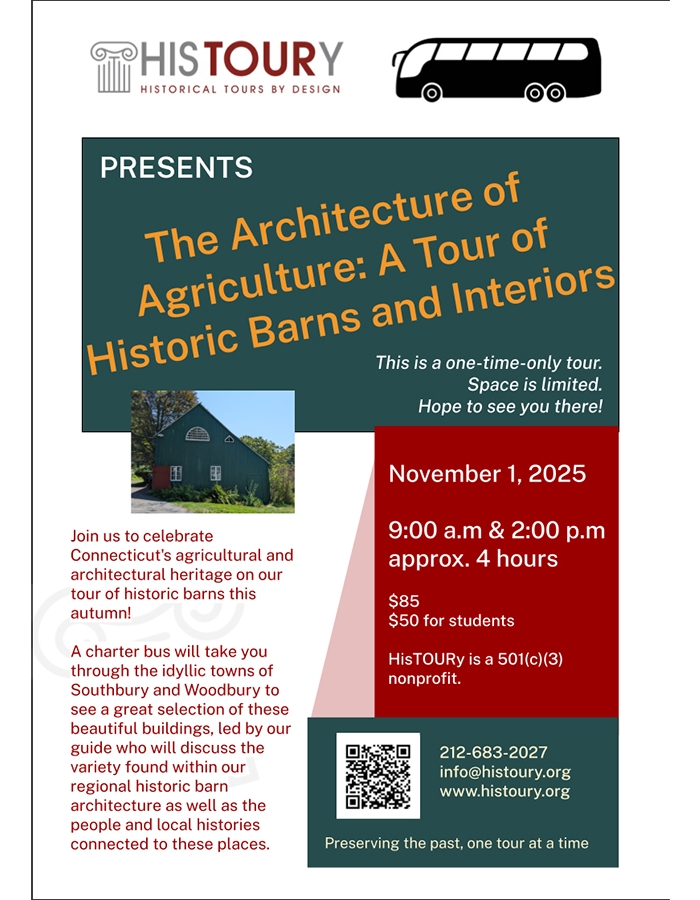 Histoury is proud to present this tour to also celebrate the 50th Anniversary of the nonprofit Preservation Connecticut and commemorate their achievements in protecting the state's historic barns and countless other places. Happy Birthday to our partners in preservation!