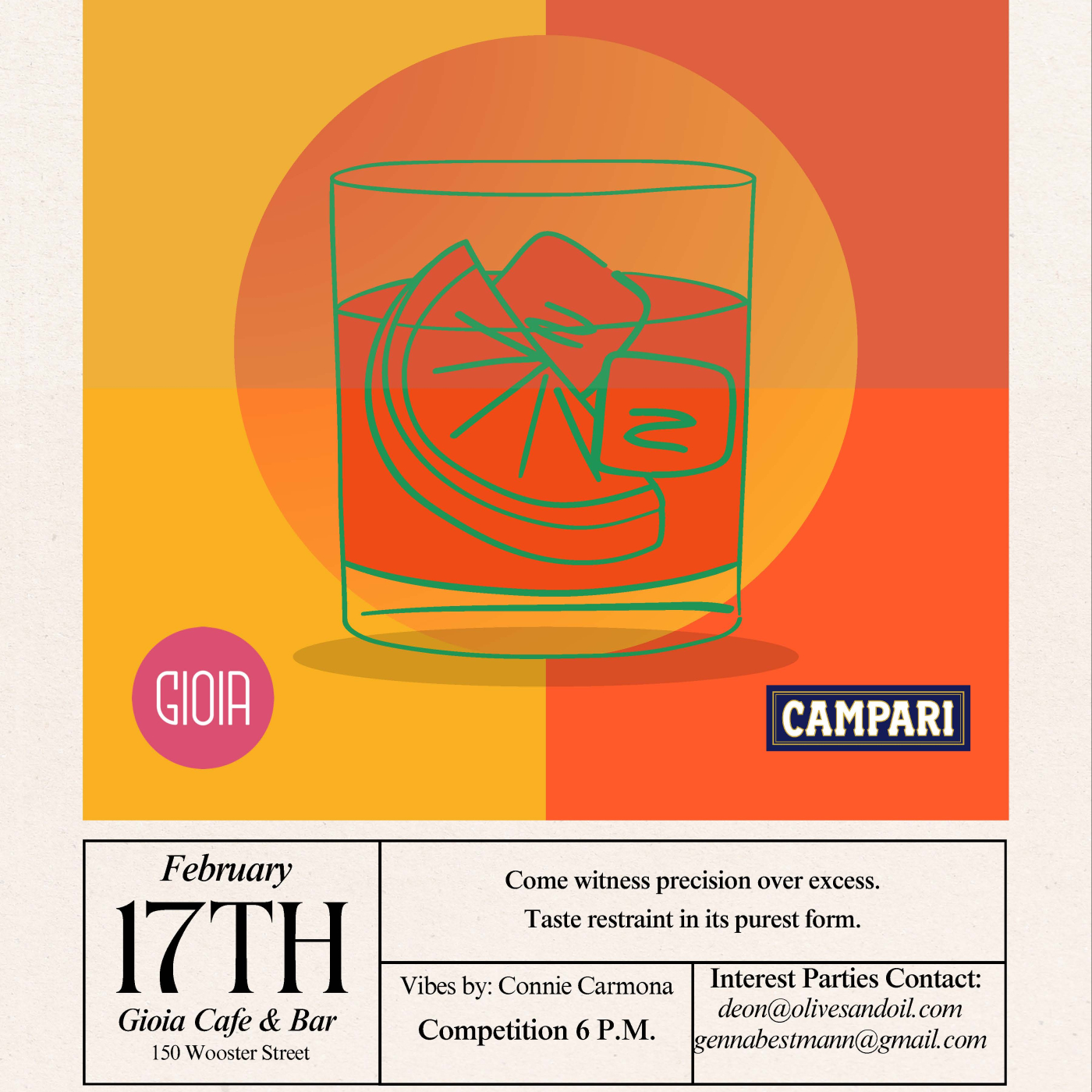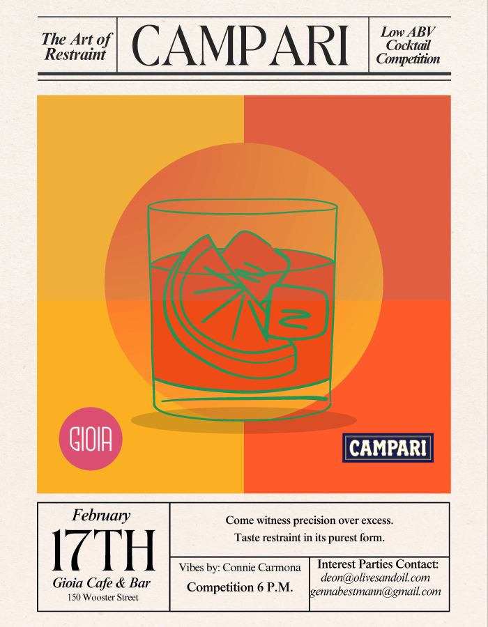 Gioia is hosting The Art of Restraint – a Campari family Low-ABV cocktail Competition – on its rooftop on Tuesday, February 17 beginning at 6:30pm. Free and open to the public, come cheer on your favorite local bartenders and sample their creations while enjoying vibes from Connie Carmona.