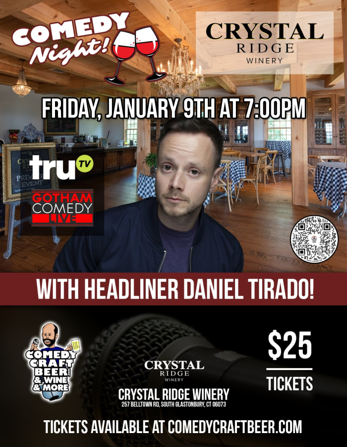 Join us for Comedy Night at Crystal Ridge Vineyard. The show will take place indoors. Capacity is limited. COME EARLY to get your seats and enjoy some wine and beer before the show.