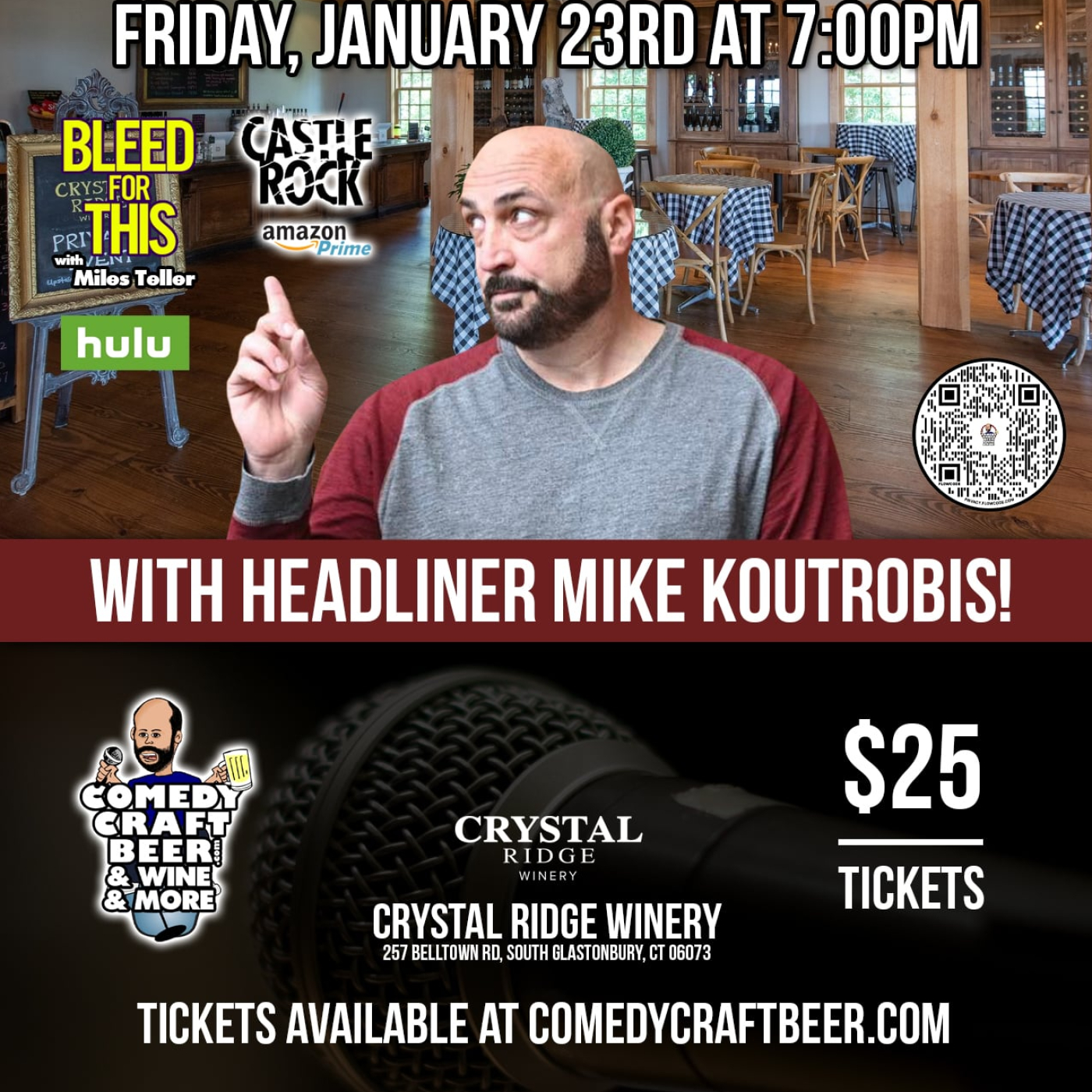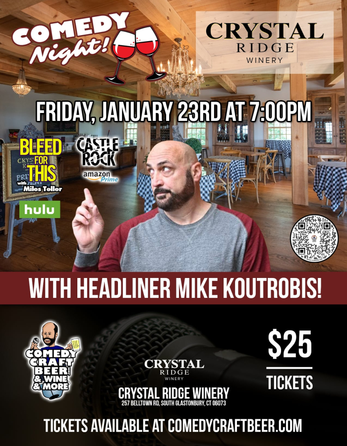 Join us for Comedy Night at Crystal Ridge Vineyard. The show will take place indoors. Capacity is limited. COME EARLY to get your seats and enjoy some wine and beer before the show.