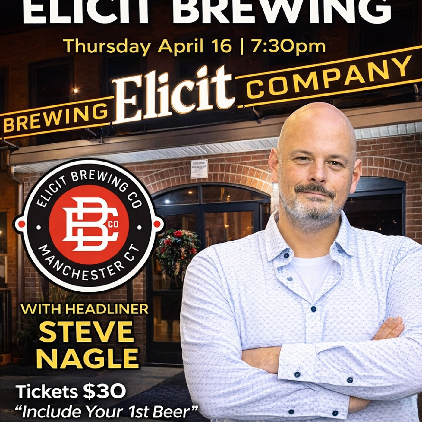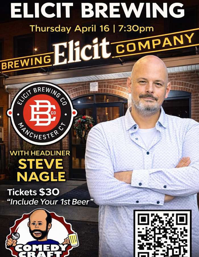 Join us for Comedy Night at Elicit Brewing in Manchester. The show will take place indoors. COME EARLY to get your seats and enjoy some wine, beer, and food before the show.