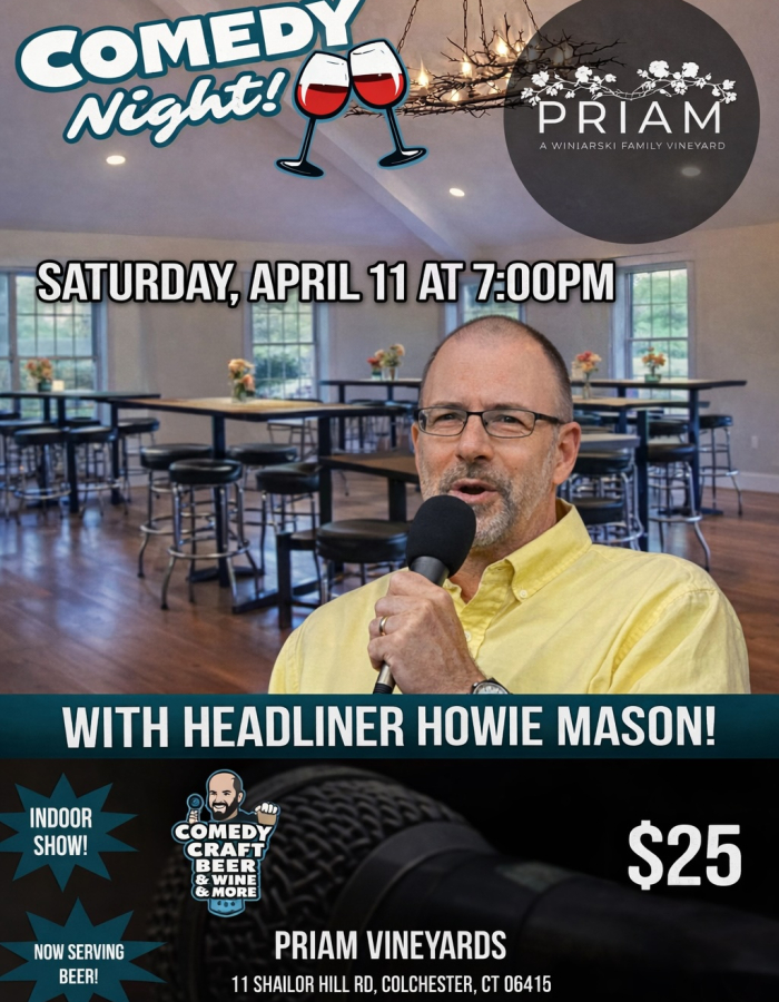 Join us for Comedy Night at Priam Vineyards. The show will take place indoors in the tasting room. Beer, wine, and light snacks are available in the tasting room. You're also welcome to bring your own food.