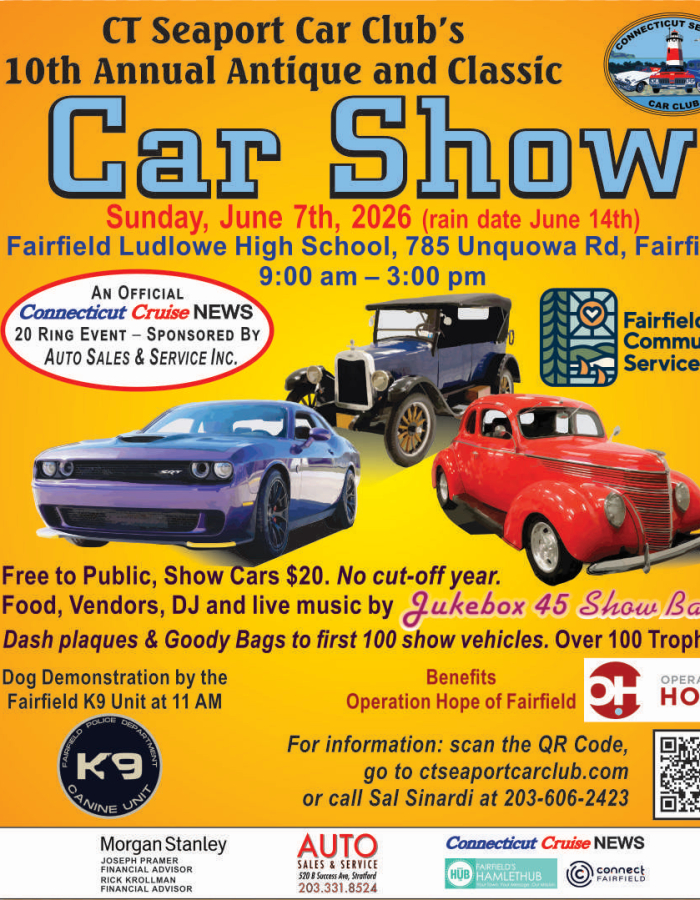 Special Events throughout the Day: The excitement kicks off at 10:30am with a blessing of the show cars by a Jesuit Priest. At 11:00am, don’t miss the impressive demonstration by the Fairfield Police K9 Unit. Then let the good times roll with live music from Jukebox 45 Show Band—Connecticut’s premier 50’s & 60’s band—performing from 11:30am to 1:00pm.