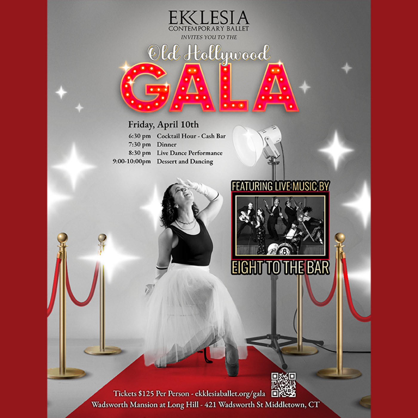 The Gala is Ekklesia Ballet’s most important fundraising event of the year. Featuring a dance performance by Ekklesia Contemporary Ballet and LIVE music by renowned CT band Eight to the Bar! This event not only launches brilliant artistic works, but also supports valuable education and community engagement initiatives in our city. This event is open to the public and is for ages 18 years and older. Ekklesia Contemporary Ballet is a non-profit 501c3 organization. All donations are tax deductible and will go into furthering our Mission!