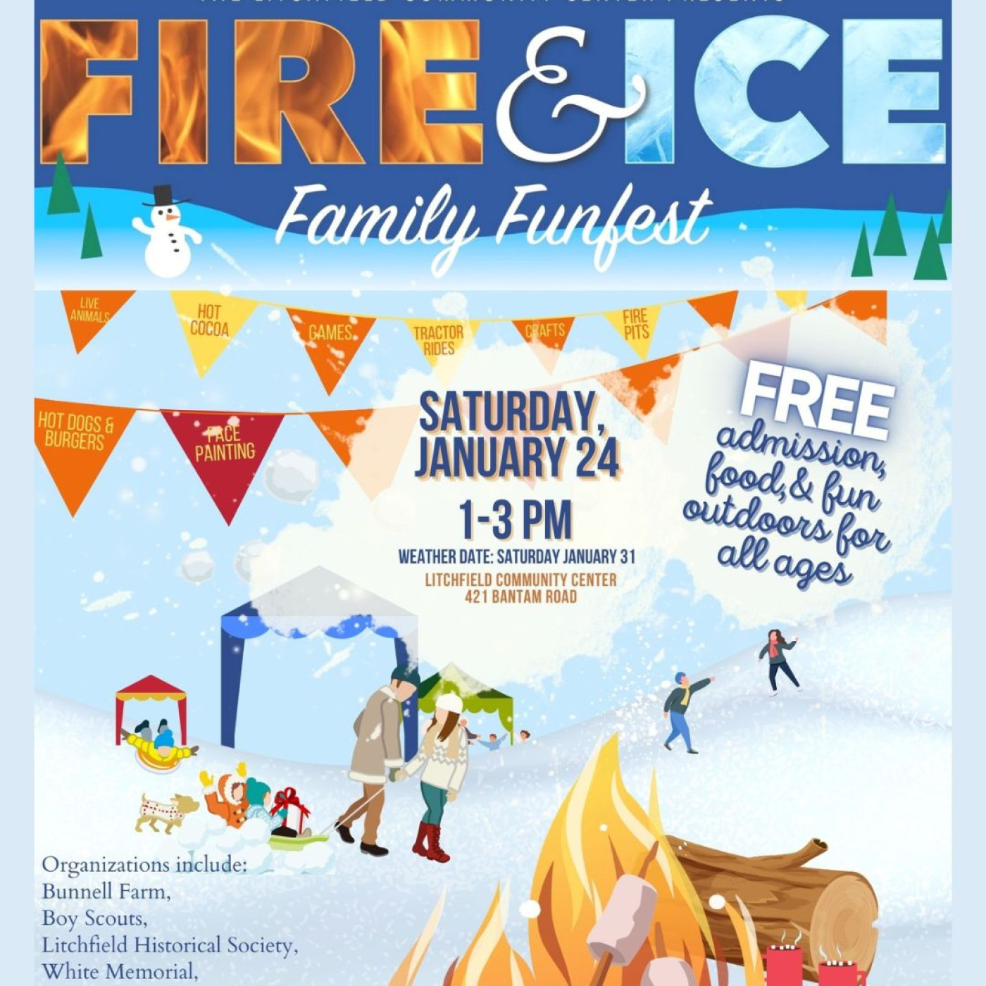 Join us at The Litchfield Community Center for our annual Fire & Ice Family Funfest — a free outdoor celebration for all ages. Enjoy an afternoon filled with winter-themed activities, cozy fire pits, food, games, and family-friendly fun.