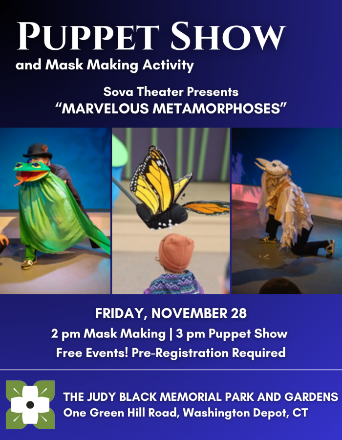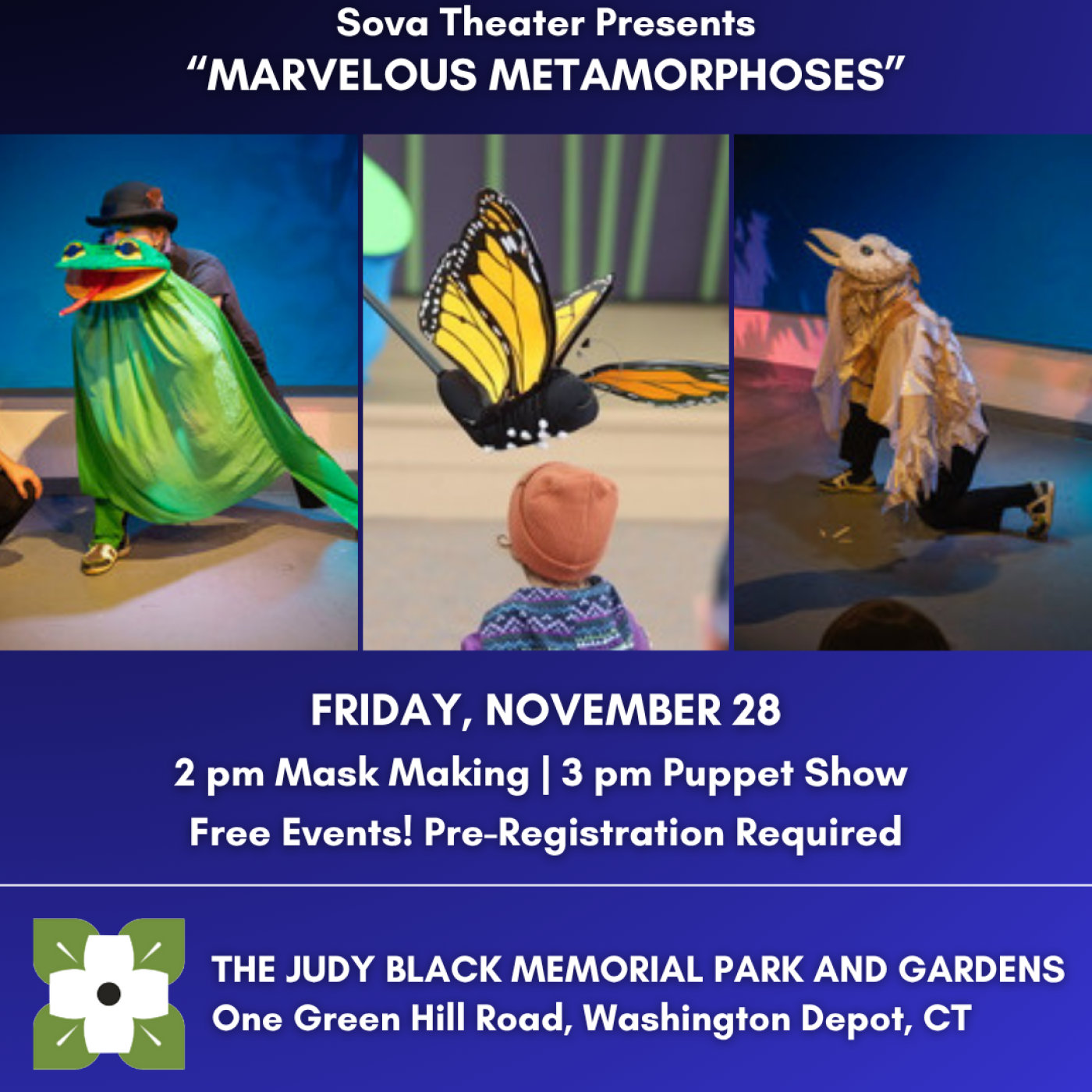 The Judy Black Memorial Park and Gardens invites community members of all ages to experience “Marvelous Metamorphoses,” a whimsical puppet show presented by Sova Dance & Puppet Theater on Friday, November 28. The event kicks off with a hands-on mask-making workshop at 2 p.m., followed by the puppet show at 3 p.m