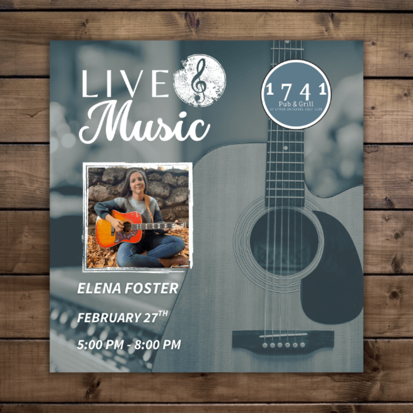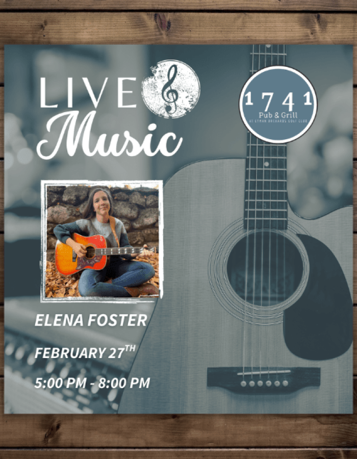 Join us for live music, great food and drinks at 1741 Pub & Grill on select Friday nights in February! February 27th, Elena Foster will be playing from 5 PM - 8 PM.