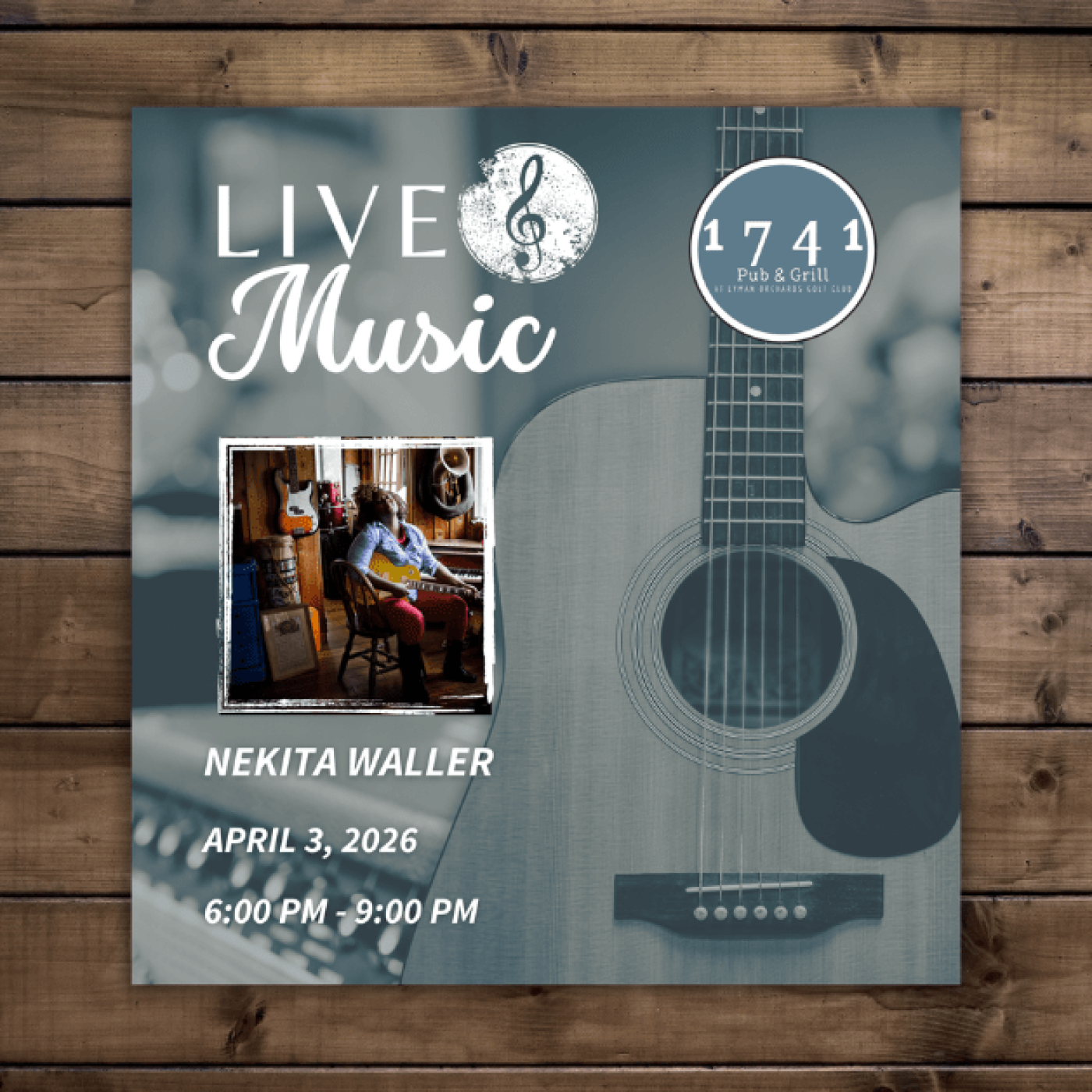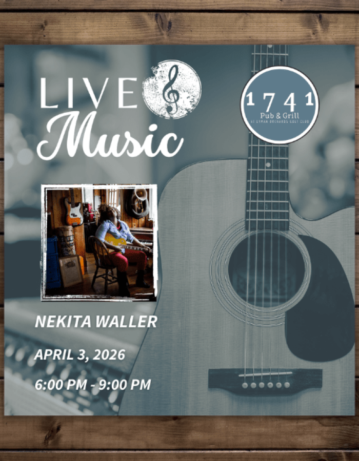 Join us for live music, great food and drinks at 1741 Pub & Grill on Friday nights in April! April 3rd, Nekita Waller will be playing from 6 PM - 9 PM.