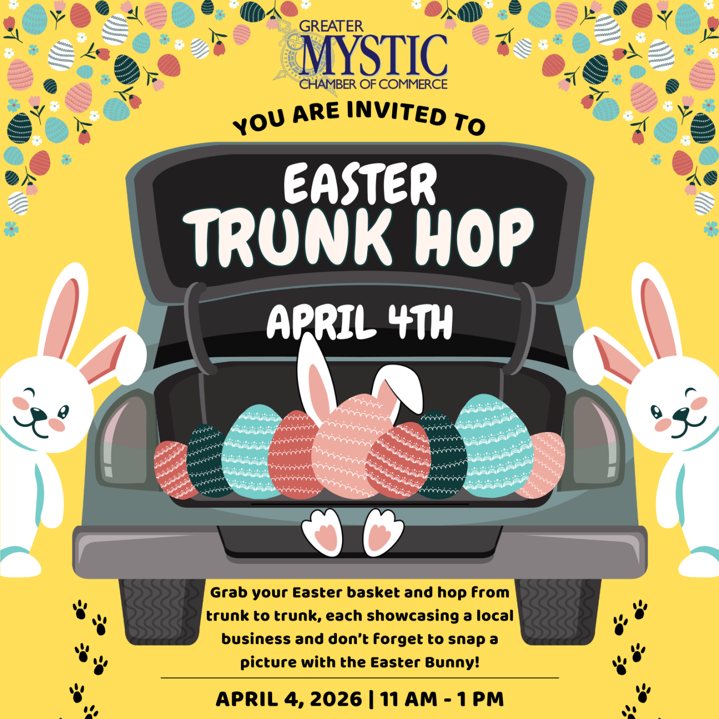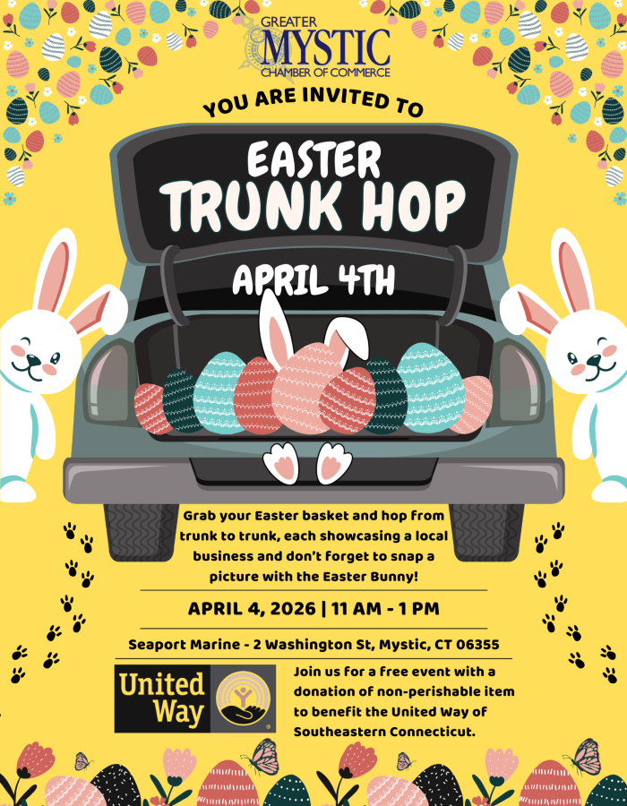 🌸 Happy Spring, Mystic! 🌸 April is here, and we’ve got an exciting event for the whole community! Join us for our second EASTER TRUNK HOP on April 4th from 11am to 1pm at Seaport Marine Parking Lot ! 🎉 Local businesses will park and set up their trunks to hand out surprise filled Easter eggs to kids. We’ll have the Easter Bunny present for photos in front of our Traveling Visitor Center, plus a few other surprises along the way! This event is FREE to attend for all families with a donation of a non-perishable food item, and it’s a great way to support local businesses and celebrate spring together. 🐰🌷 We hope to see you there for a fun-filled day! Let us know if you have any questions. #EasterTrunkHop #CommunityEvent #MysticCT #SpringFun #SupportLocal