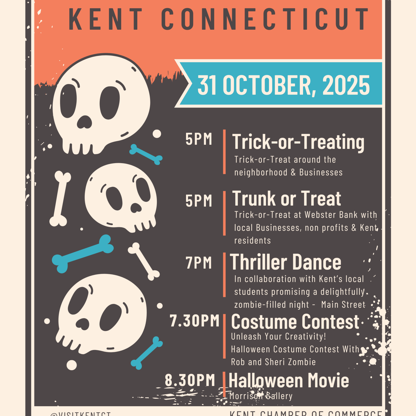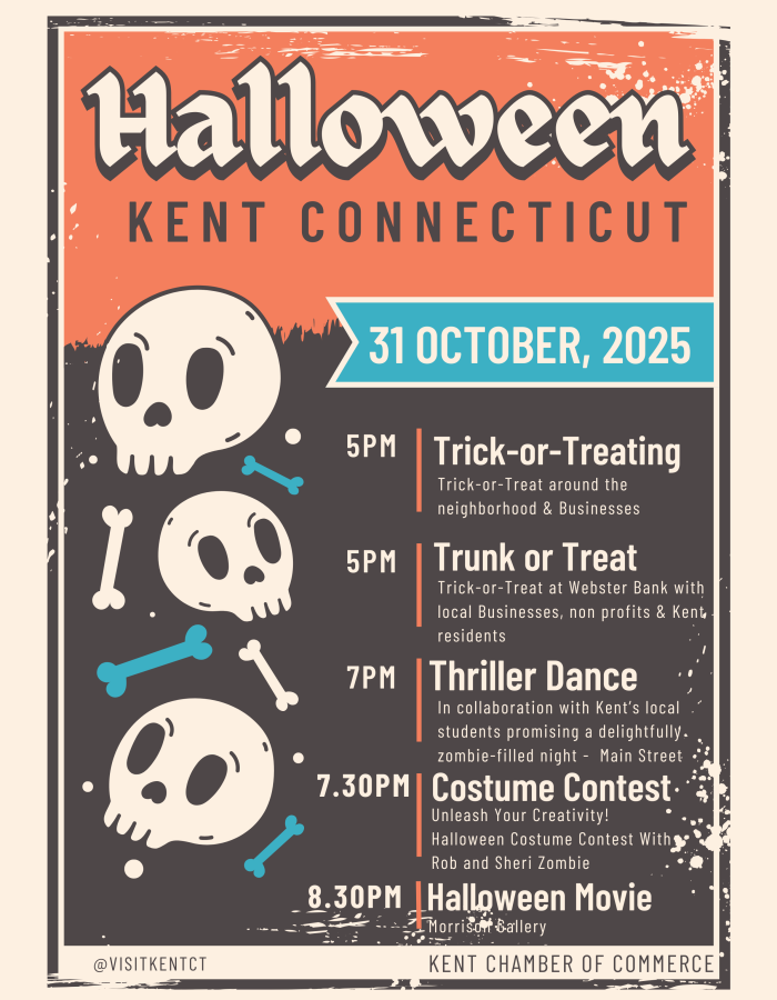 Kent, CT — This Halloween, the charming town of Kent, Connecticut is turning into a spirited hub of frightful fun for all ages! From trick-or-treating and a “Thriller” flash mob to a full costume contest with celebrity judges, Halloween Night in Kent promises to be the can’t-miss celebration of the season.