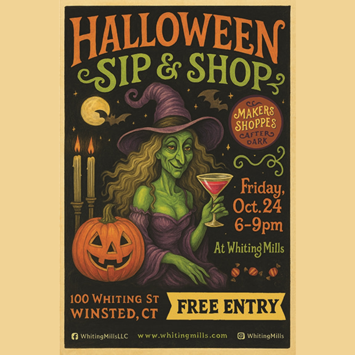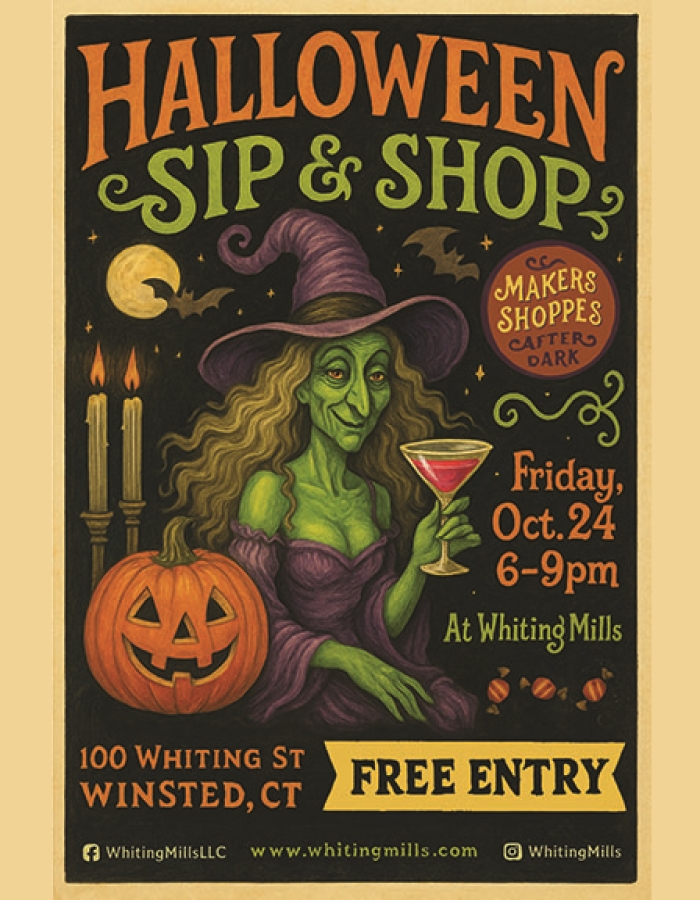 The Makers Shoppes of Whiting Mills invite you to step into the shadows and celebrate creativity under the spell of autumn at their First Annual “Halloween Sip & Shop After Dark,” taking place Friday, October 24th from 6–9 P.M. at 100 Whiting Street, Winsted, CT 06098.
