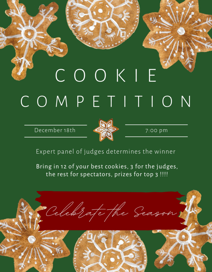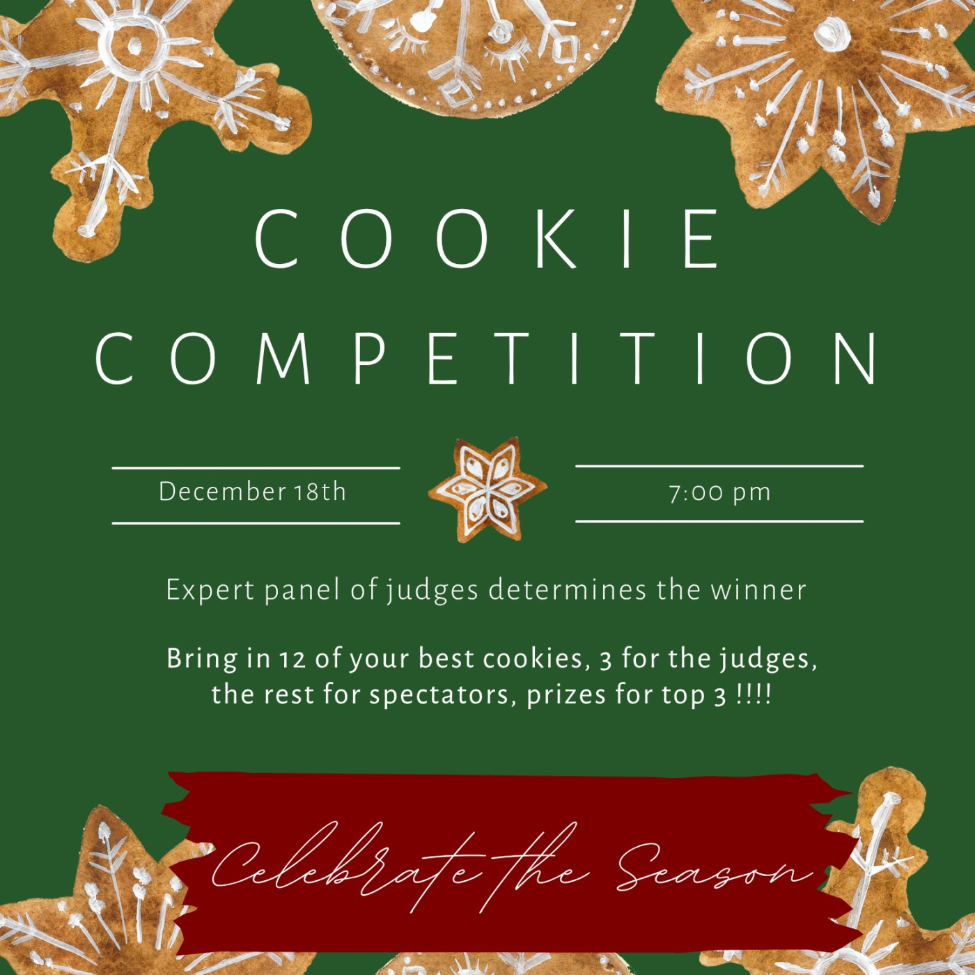 CELEBRATE the SEASON with our Holiday Cookie Championship. Bake 12 of your best cookies bring them on Thursday 18 December at 7 pm and our 3 "expert" judges will determine the winner in a blind tasting.