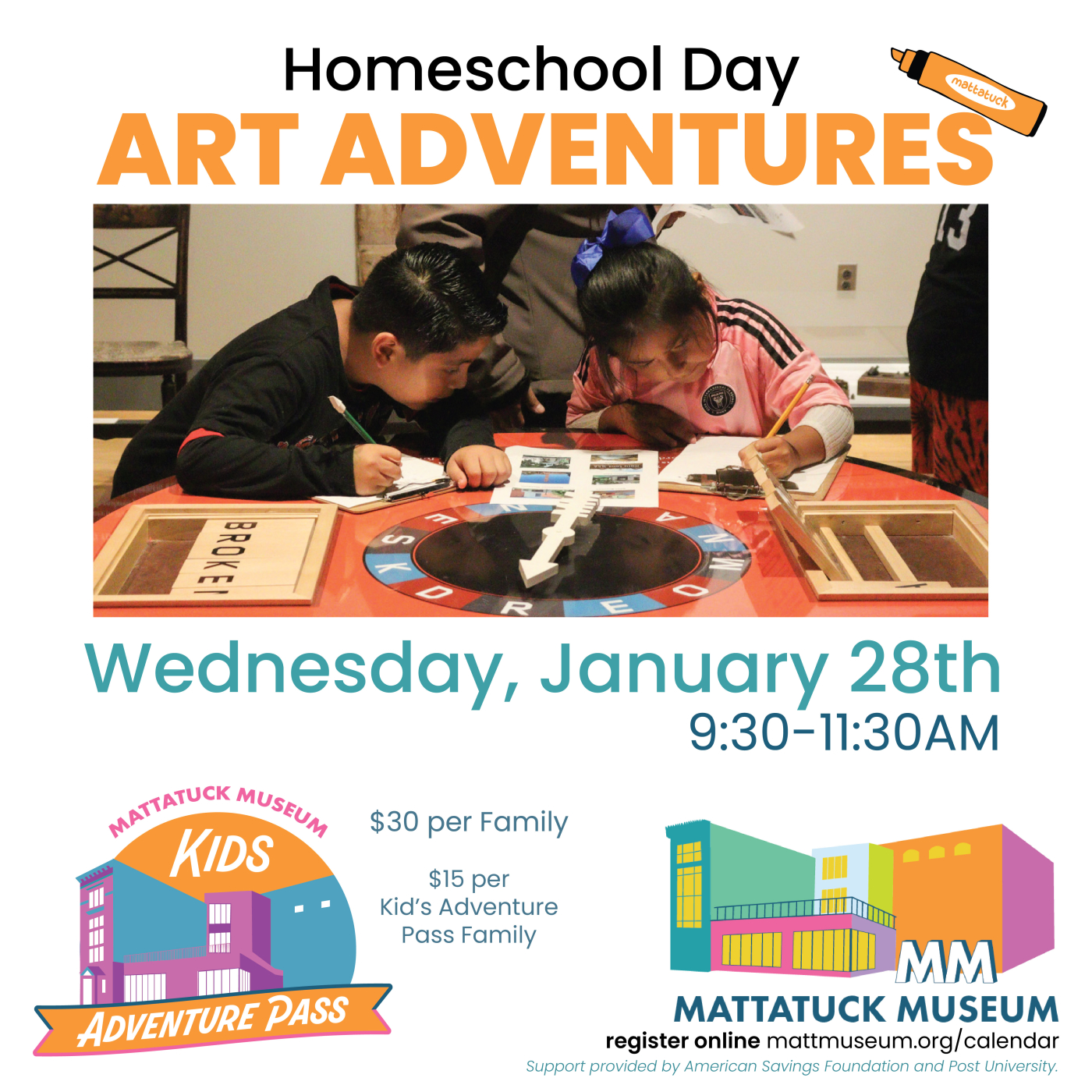 Get ready for an adventure! Homeschool families are invited to embark on a museum-wide scavenger hunt, working together to find the art supplies they’ll use to create their own masterpiece. This is a great opportunity for homeschool families to interact with one another, while exercising their creativity through art!