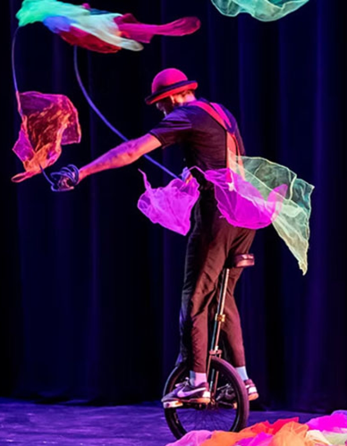 Janoah Bailin’s delightful meSSeS features precarious unicycling, shimmering puppetry, jaw-dropping juggling, and mesmerizing motions. Janoah the Jester tosses together a tale of learning and labor, emerging ecstatically from a haphazard pile of props. Part performance, part workshop, entirely entertaining – YOU learn to juggle while watching this (optionally interactive) all-ages experience. In between acts, Janoah engagingly guides the audience through the essentials: throwing, catching, and messy-ing up!